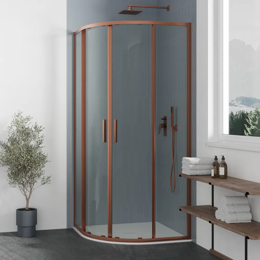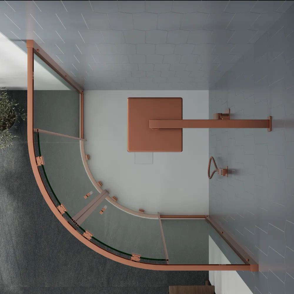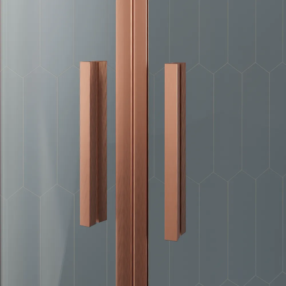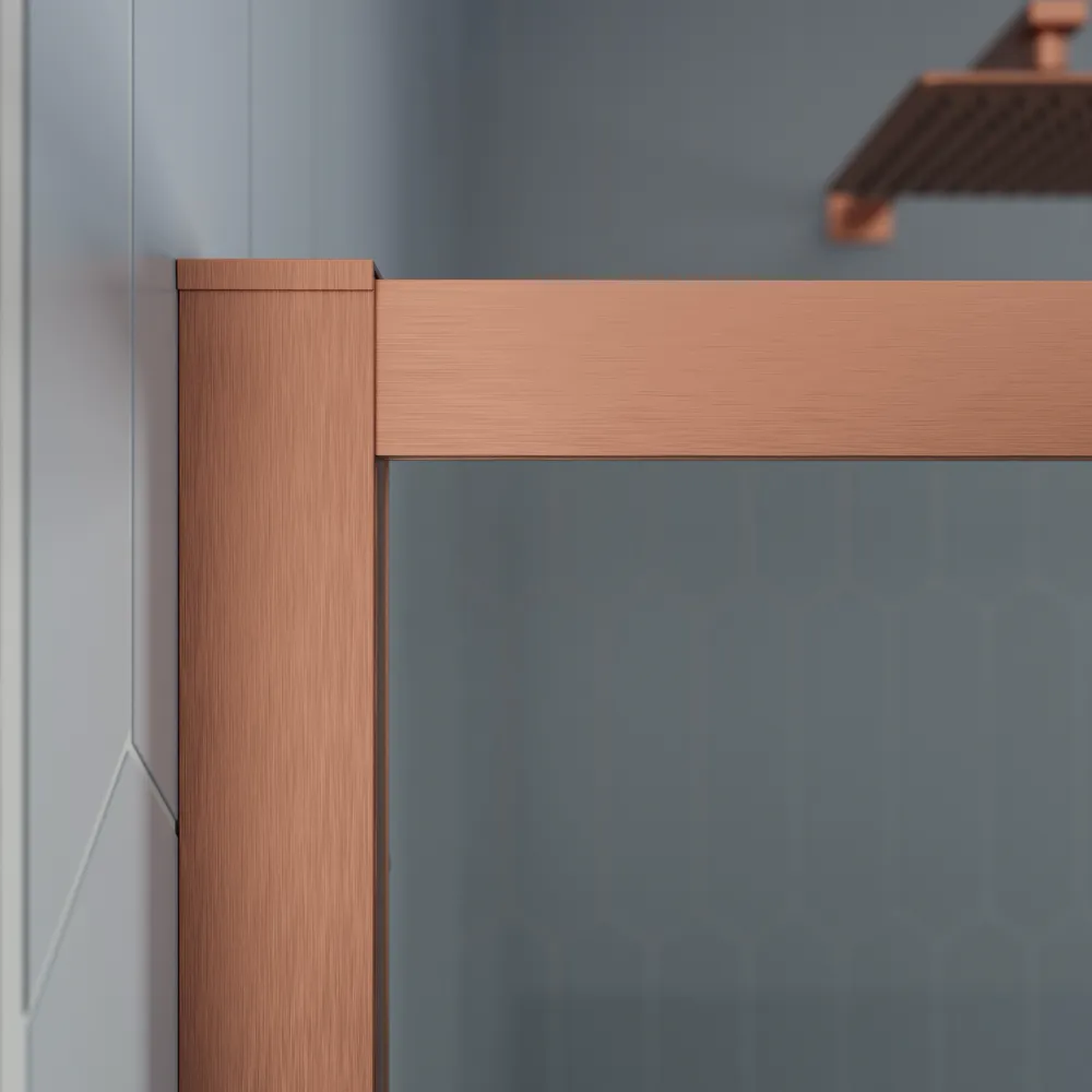 Realizzato con profili slim in alluminio rame spazzolato, il box doccia Portofino non solo garantisce resistenza e durata, ma aggiunge anche un tocco di raffinatezza al tuo spazio. Il vetro temperato trasparente anticalcare dello spessore di 6mm garantisce una sicurezza ottimale, mentre il suo design minimalista arricchisce l'estetica del tuo bagno.