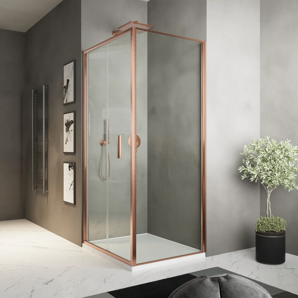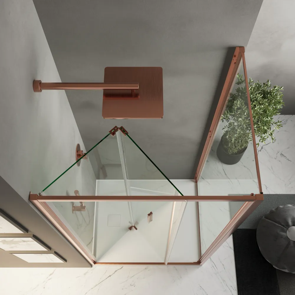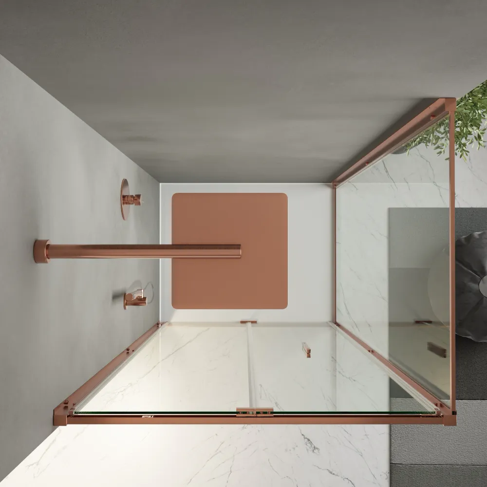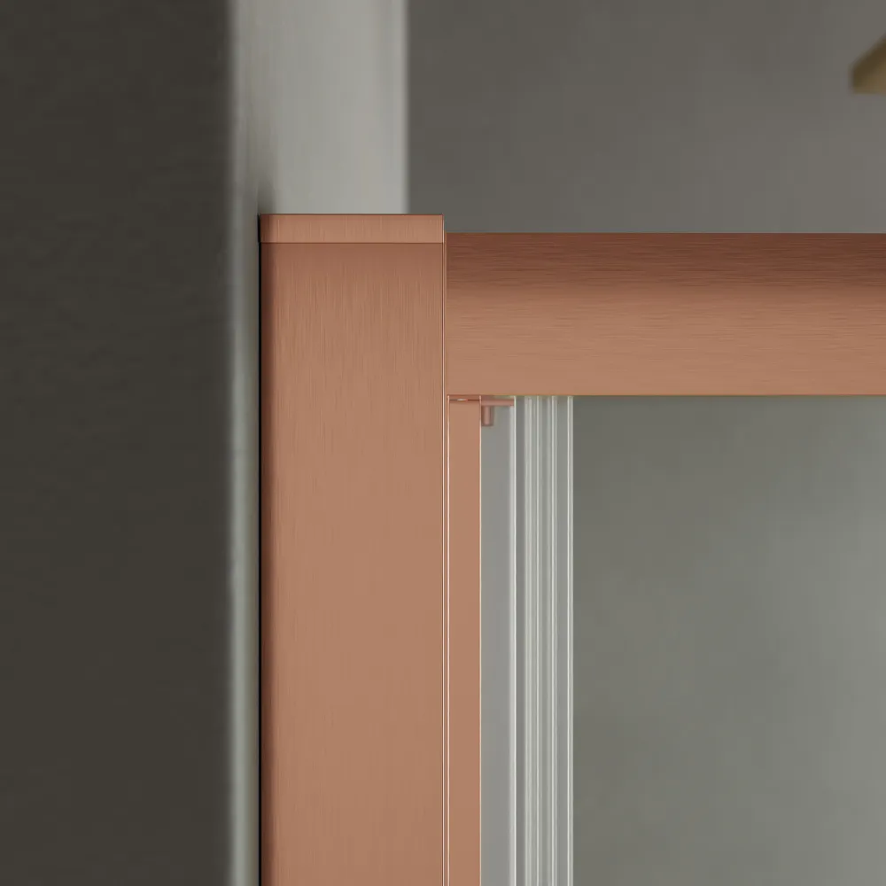 Realizzato in vetro temperato trasparente anticalcare di alta qualità, spesso 6mm, il box offre una combinazione ideale di robustezza e trasparenza. Gli eleganti profili slim in alluminio rame spazzolato aggiungono un tocco di sofisticatezza e modernità. Questo accento scuro crea un bel contrasto con il vetro, rendendo il box doccia un elemento distintivo e di design nel tuo spazio.