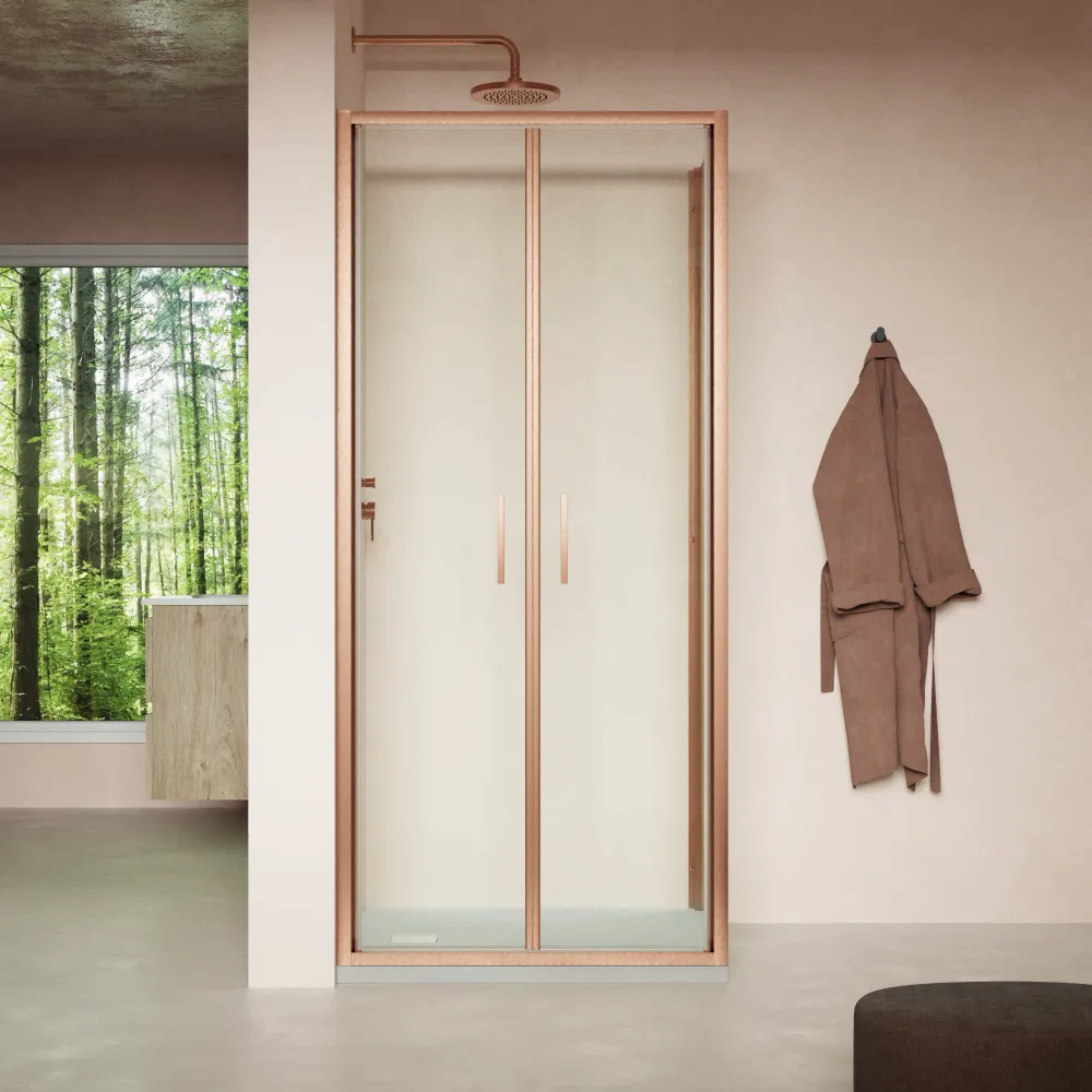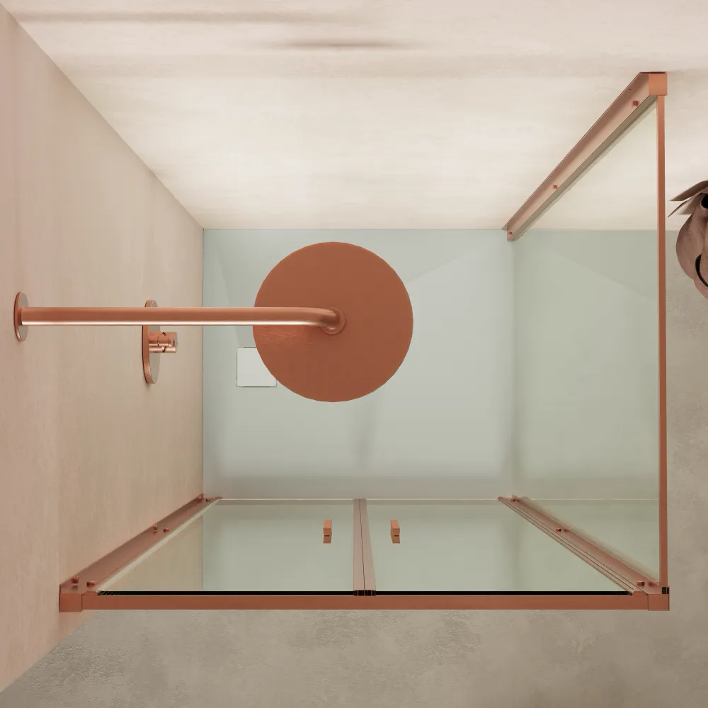 Un ulteriore peculiarità di questo box doccia sono i profili in alluminio slim con finitura rame spazzolato, che conferiscono un aspetto elegante. Questi profili sottili creano un effetto visivo leggero, facendo sembrare il box doccia meno ingombrante e contribuendo a un design contemporaneo che si integra perfettamente con qualsiasi stile di arredamento.