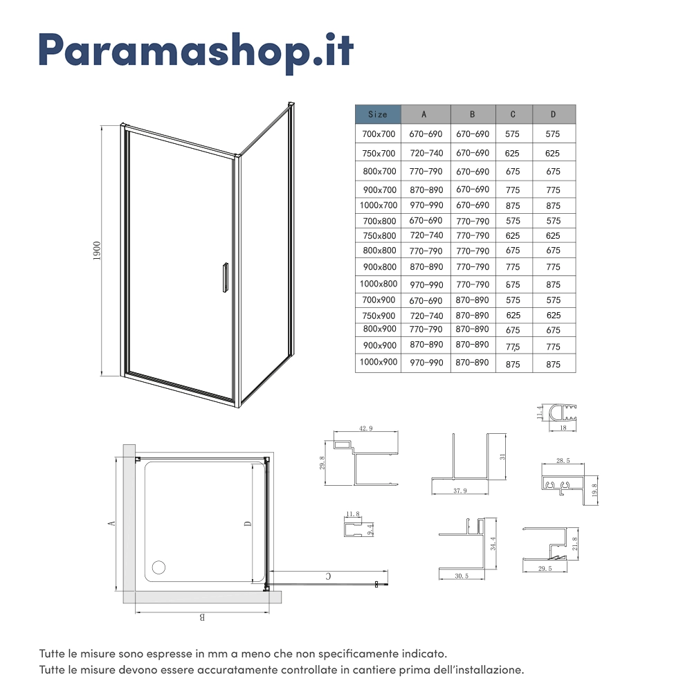 - Apertura a battente da 80cm e parete fissa da 90cm