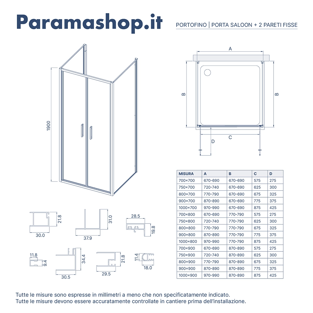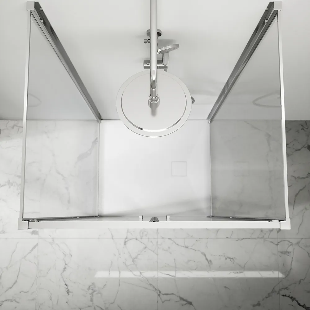 Questo modello è composto da due pareti fisse da 70cm e da una porta saloon da 70cm, un'innovazione nel design dei box doccia. Questo sistema di apertura permette di aprire la porta sia verso l'esterno che verso l'interno, garantendo un accesso comodo e senza ostacoli. Con la sua ampiezza, offre una libertà di movimento eccezionale, rendendo la tua esperienza di doccia ancora più piacevole.
