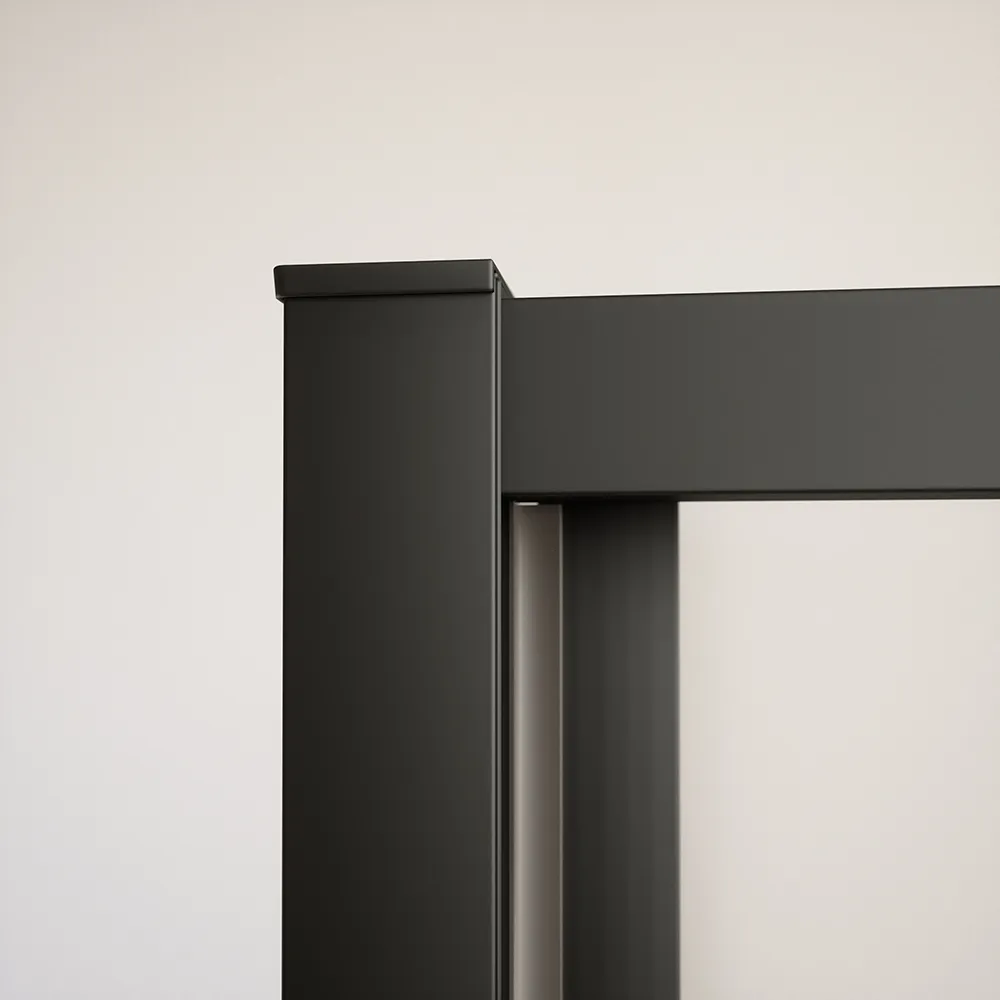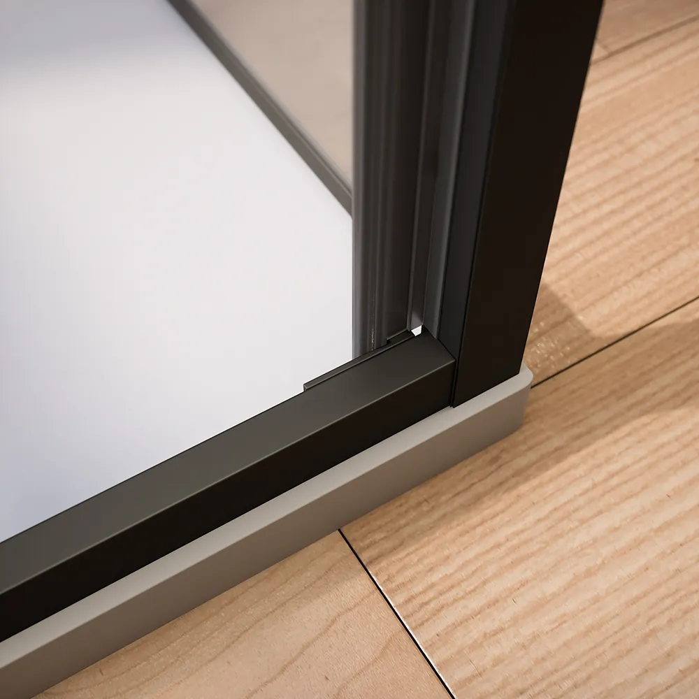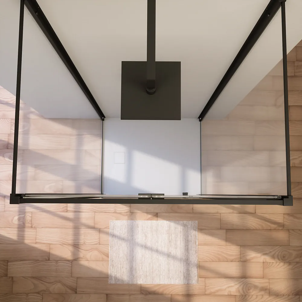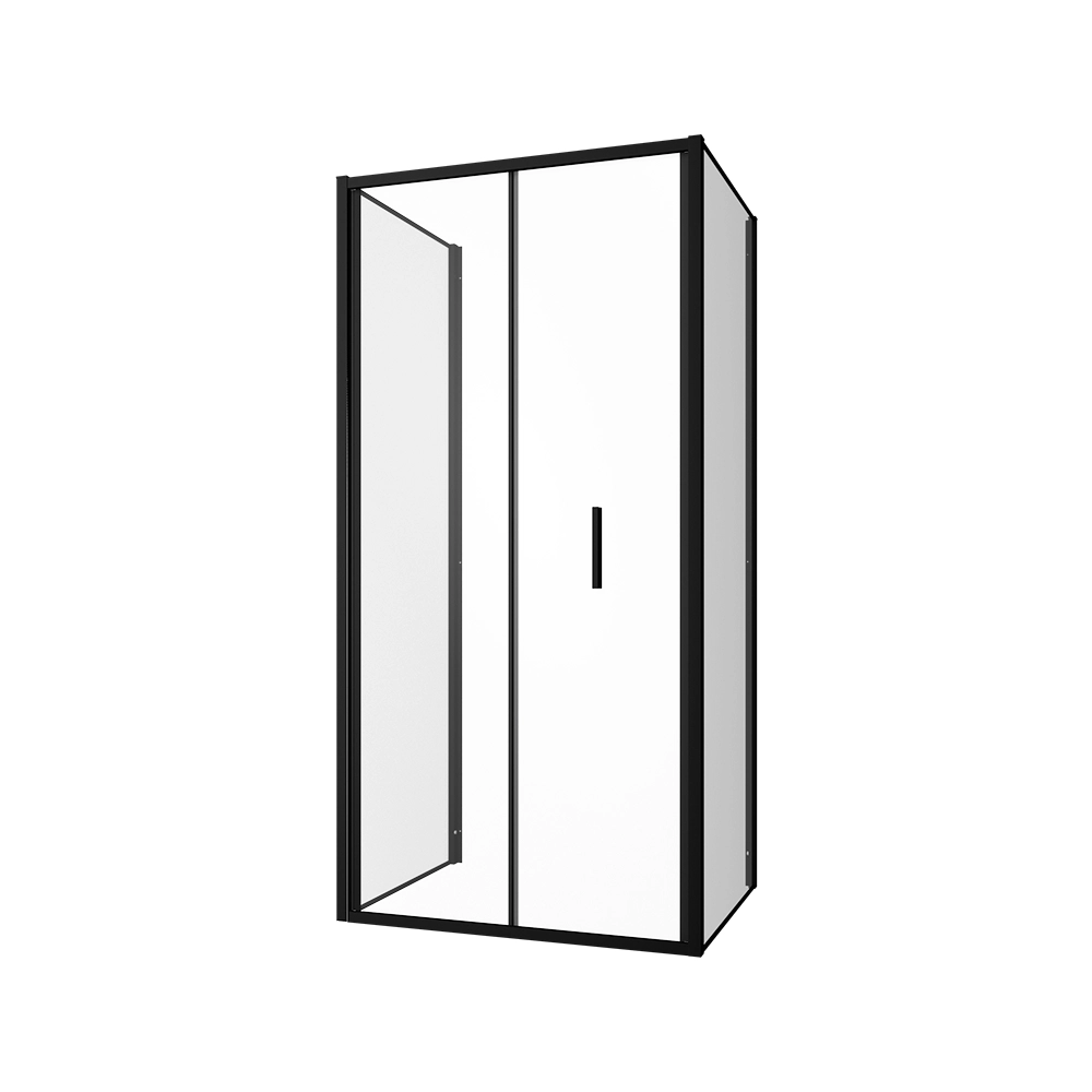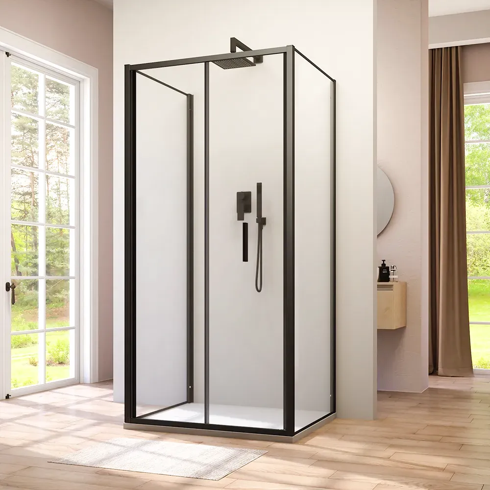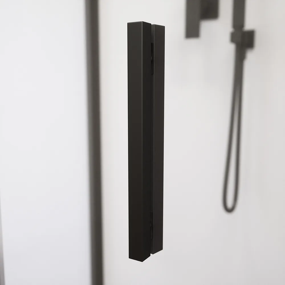 Il vetro temperato trasparente da 6 mm garantisce resistenza e sicurezza, mentre i profili slim in alluminio nero opaco conferiscono un aspetto elegante e moderno. La maniglia coordinata in alluminio nero opaco aggiunge un ulteriore tocco di raffinatezza.