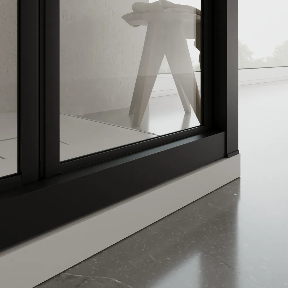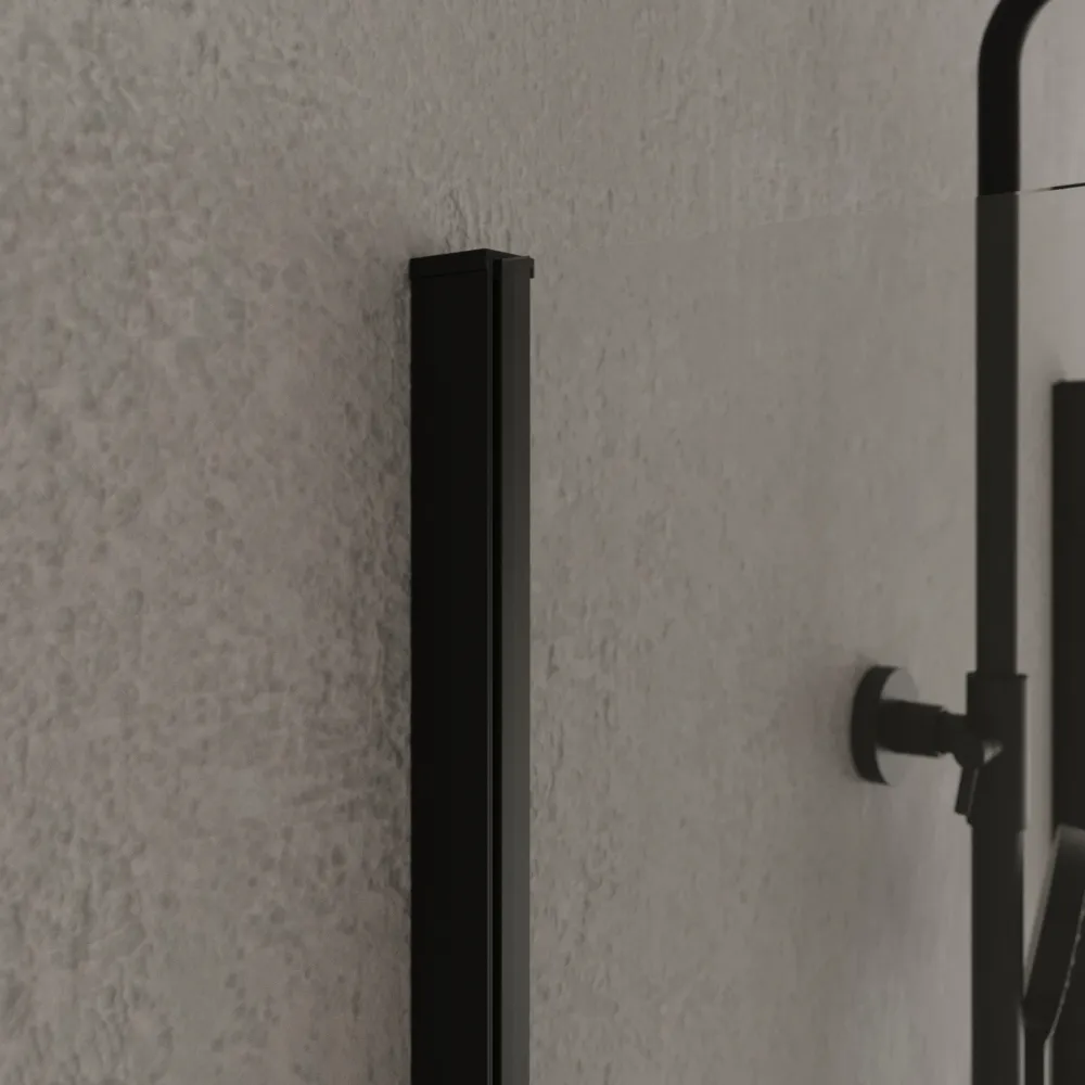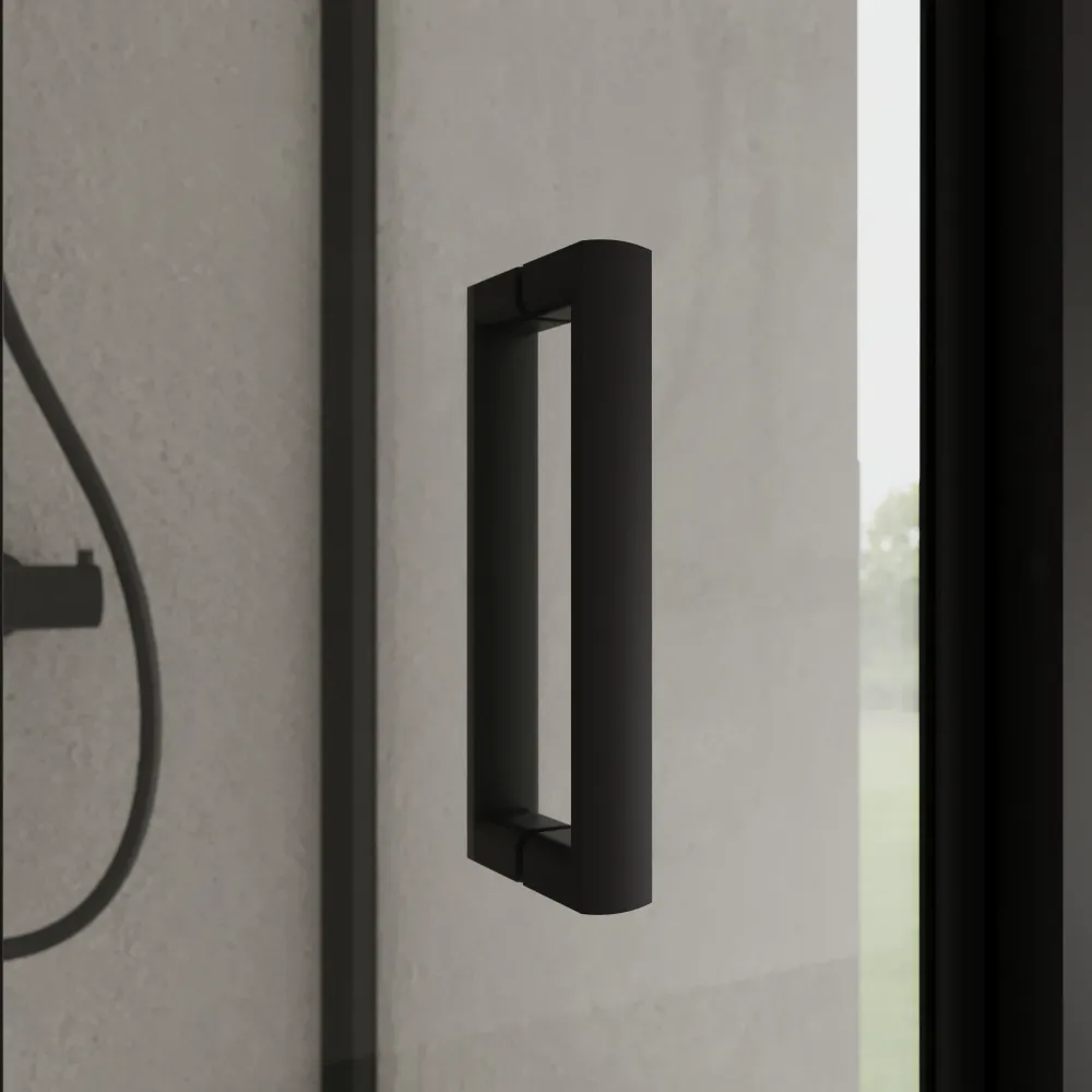Questo modello è realizzato in vetro temperato trasparente di 6 mm, certificato EN12150-1, e arricchito da profili squadrati in alluminio nero opaco, che garantiscono sicurezza, resistenza e una facile manutenzione.