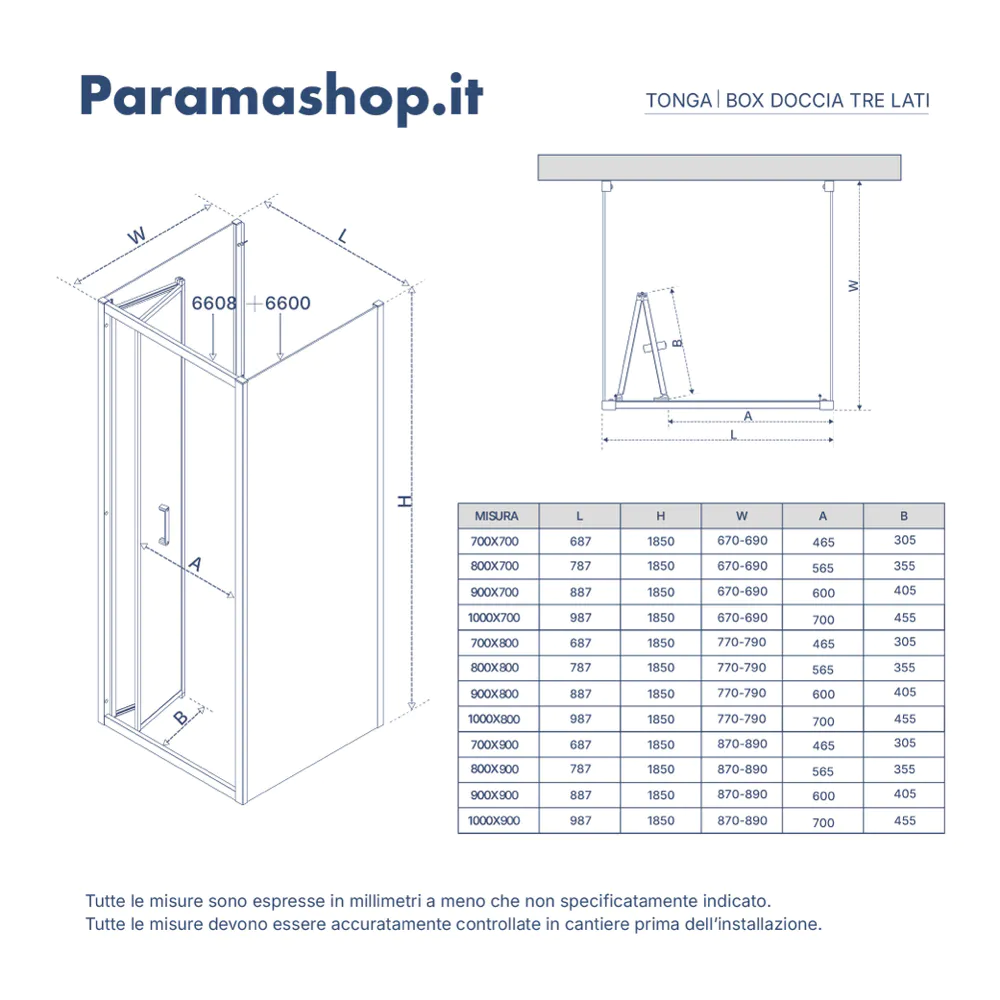 Questo modello è composto da due pareti fisse da 90 cm ciascuna e da una porta libro da 80 cm, che insieme creano un ampio spazio doccia con un accesso estremamente confortevole. L'installazione reversibile ti permette di decidere in fase di montaggio se posizionare la porta libro a destra o a sinistra, in base alla configurazione del tuo bagno. Con un’altezza di 185 cm, questo box doccia rappresenta la scelta ideale per chi cerca un prodotto di alta qualità, dal design innovativo e dallo stile moderno.