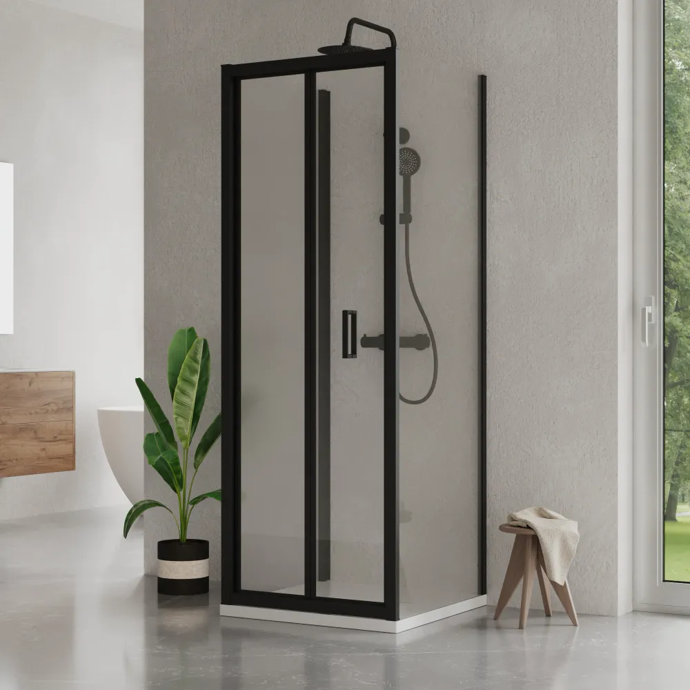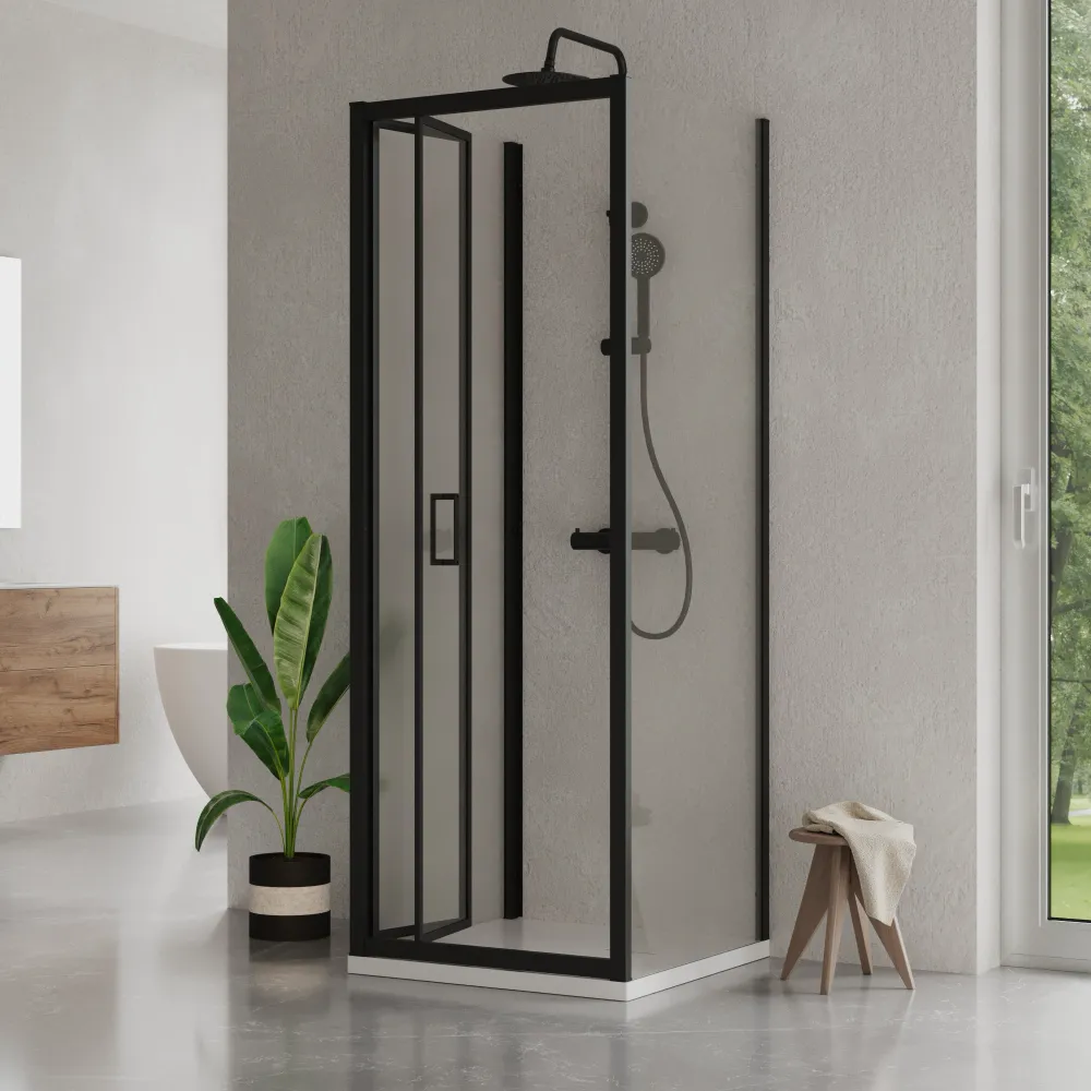 Box doccia tre lati 90x80x90cm con porta a libro profili nero opaco e vetro 6mm trasparente h185 | Madagascar