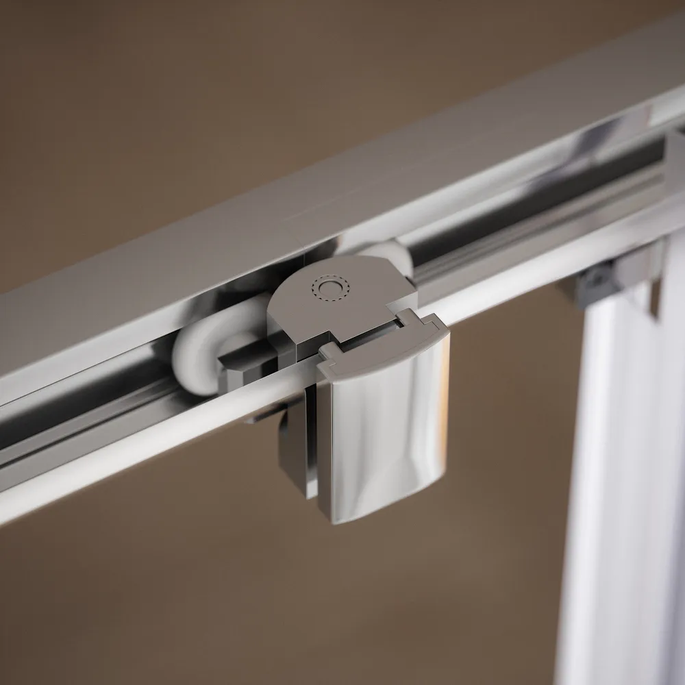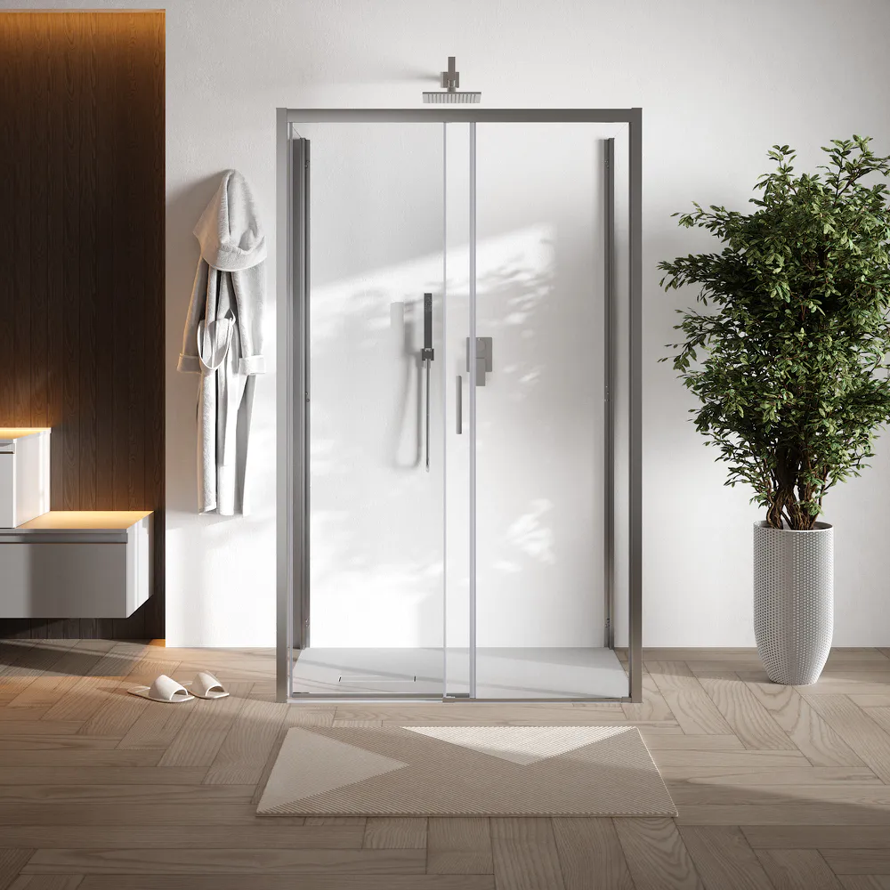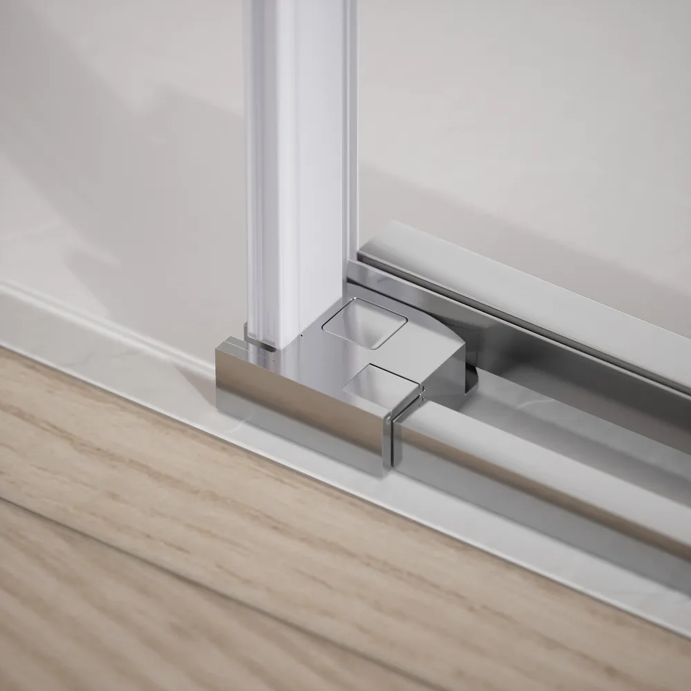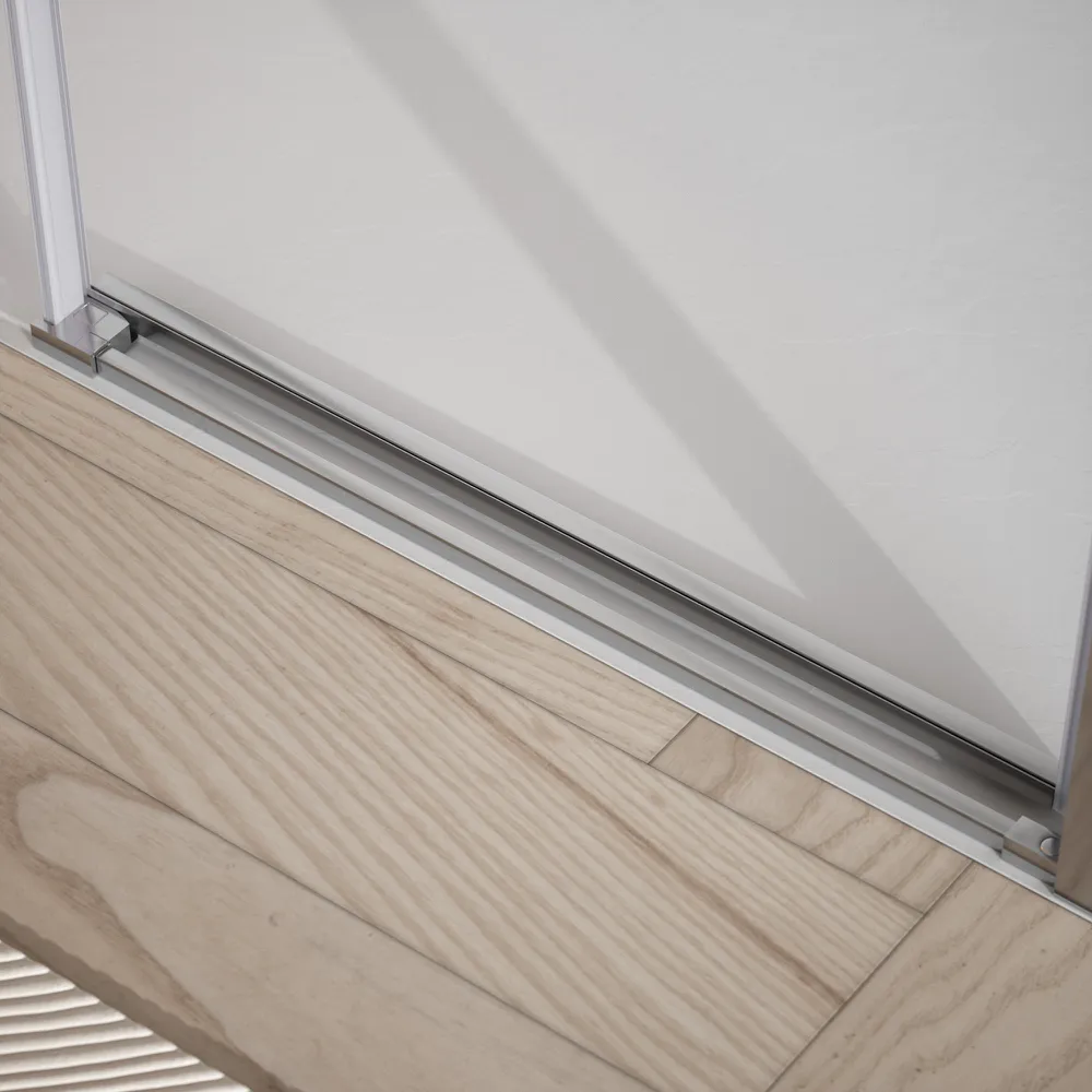 Il vetro temperato trasparente da 6 mm assicura luminosità, robustezza e sicurezza, rendendo lo spazio doccia visivamente più ampio e arioso. La superficie liscia consente una pulizia facile e veloce, mantenendo nel tempo la brillantezza e la trasparenza del vetro.