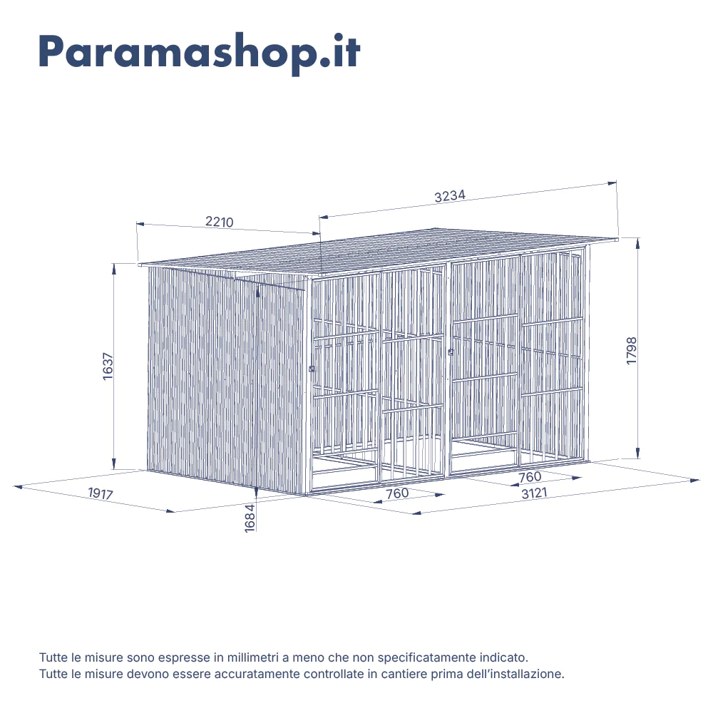 Con le sue dimensioni esterne di 323 x 221 x 180,4 cm, questo box offre uno spazio eccezionalmente ampio e confortevole per far rilassare e muovere il tuo cane in totale libertà e sicurezza.