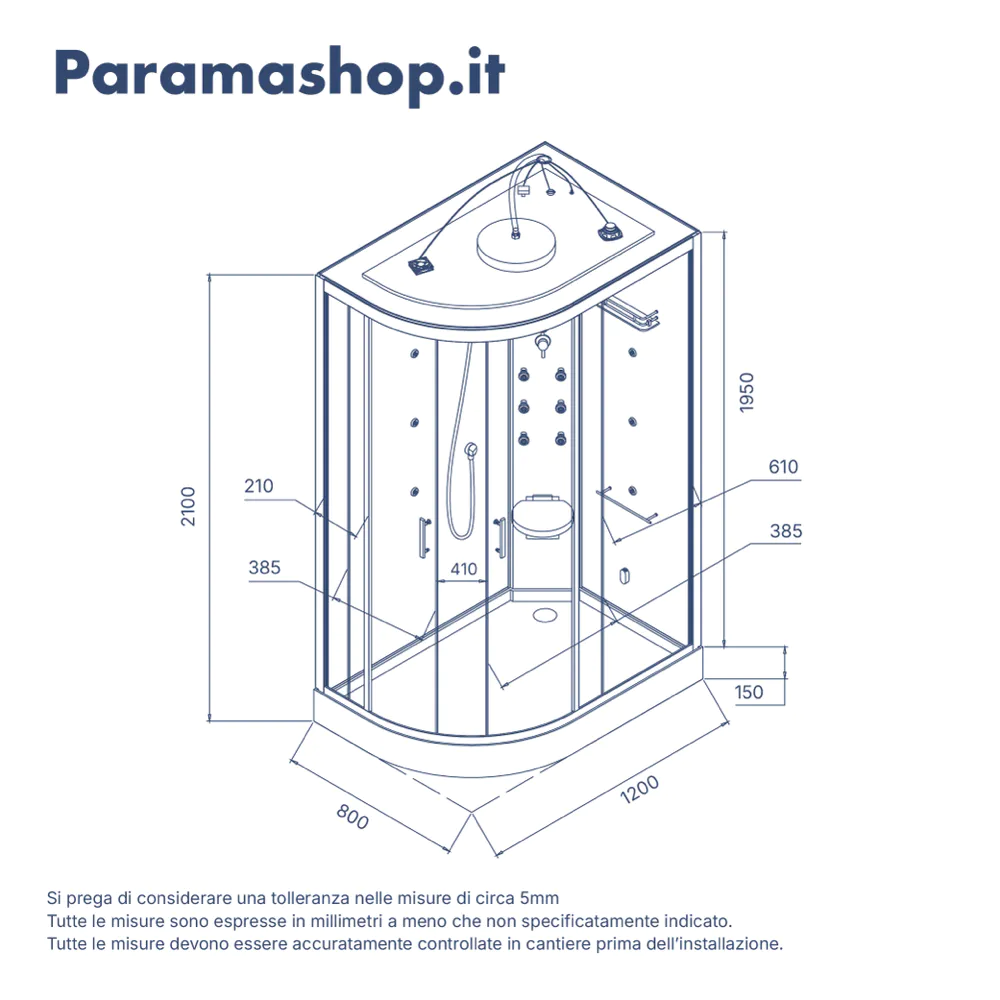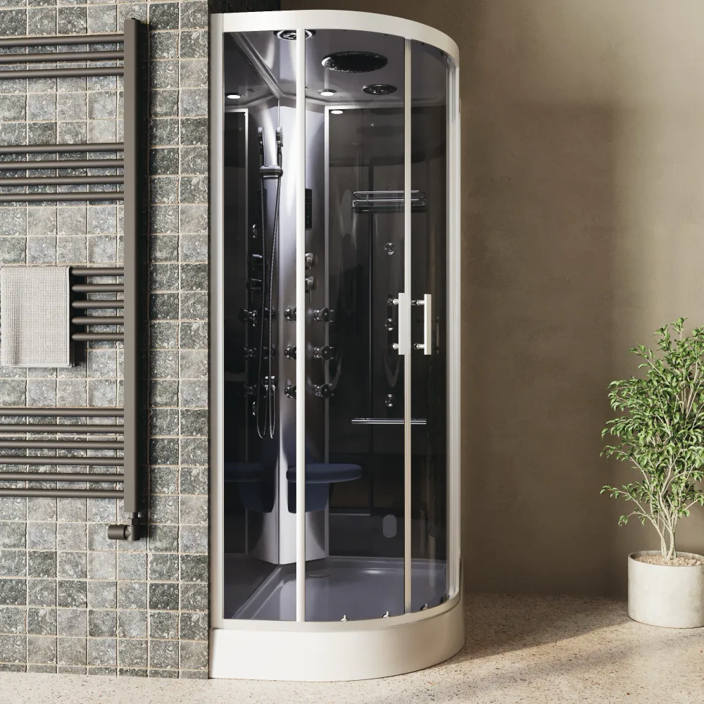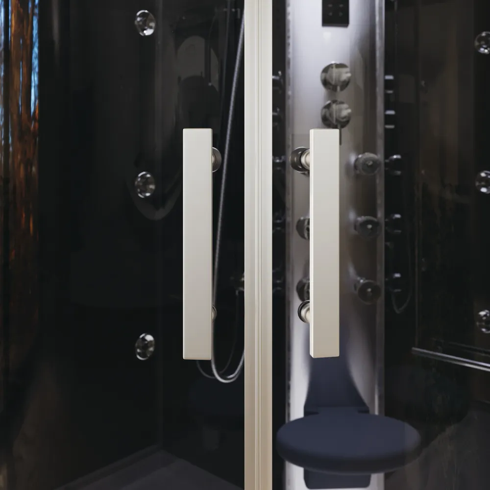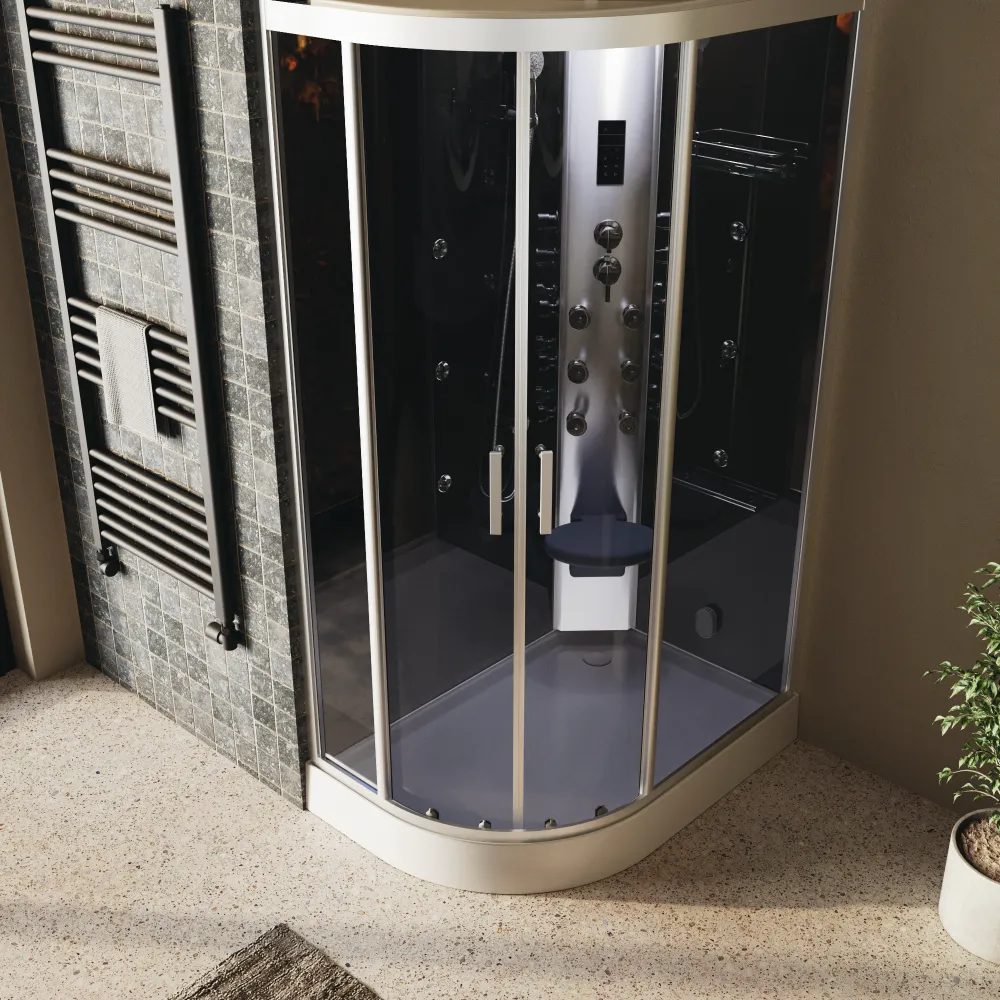 L’esperienza è arricchita dai 12 getti idromassaggio, distribuiti tra pannello e vetro, che offrono un massaggio personalizzabile, rilassante o tonificante a seconda delle esigenze. Il miscelatore a 4 funzioni consente di regolare l’intensità e la modalità del getto, mentre il pratico doccino con flessibile in acciaio inox da 1,5 metri aggiunge versatilità d’uso. Ma la vera particolarità è il generatore di vapore, che trasforma la doccia in un autentico bagno turco, perfetto per rigenerare corpo e mente.