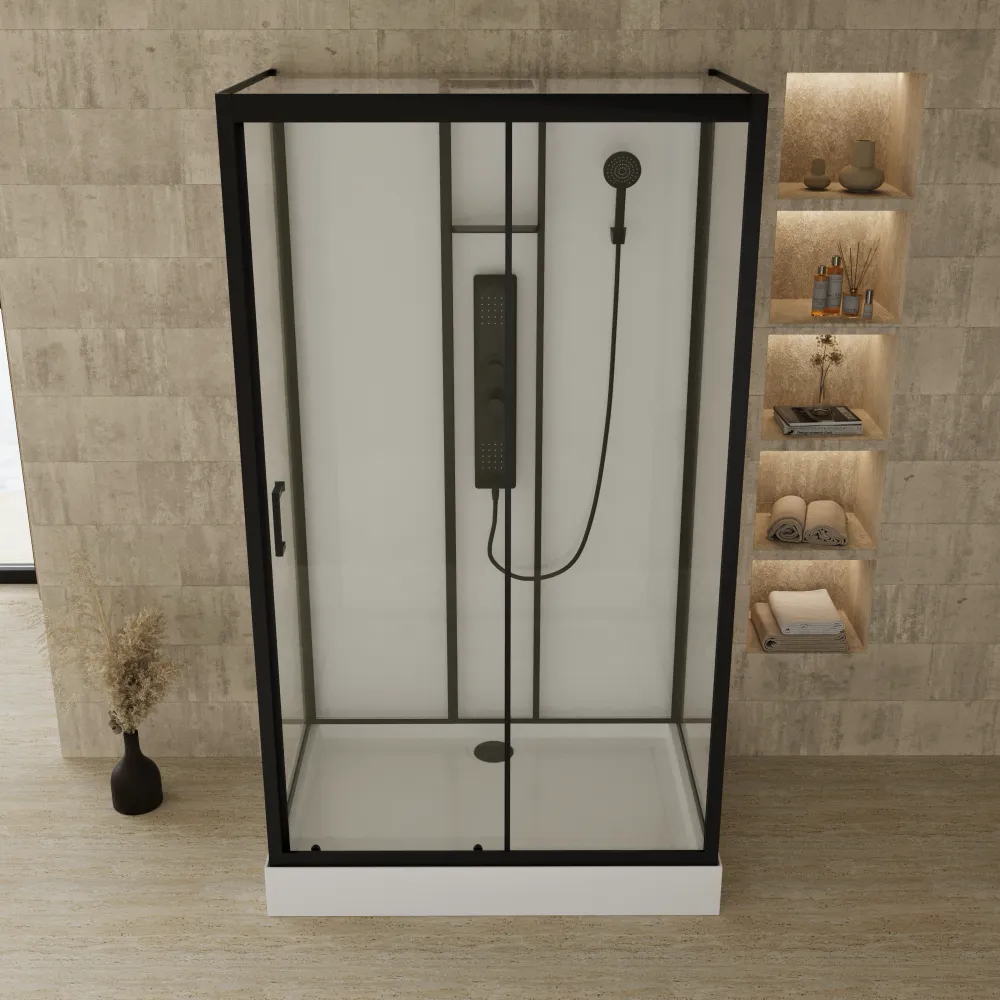 La cabina doccia combina eleganza e robustezza: la porta e il pannello fisso in vetro temperato trasparente da 5 mm garantiscono sicurezza e durata nel tempo. I pannelli laterali in vetro trasparente da 4 mm e il pannello posteriore in vetro bianco verniciato da 4 mm aggiungono un tocco minimal chic. Il tetto in vetro bianco da 5 mm è facile da pulire, mentre il piatto doccia in ABS bianco alto 15 cm è resistente e antiscivolo, per un bagno sicuro e confortevole.