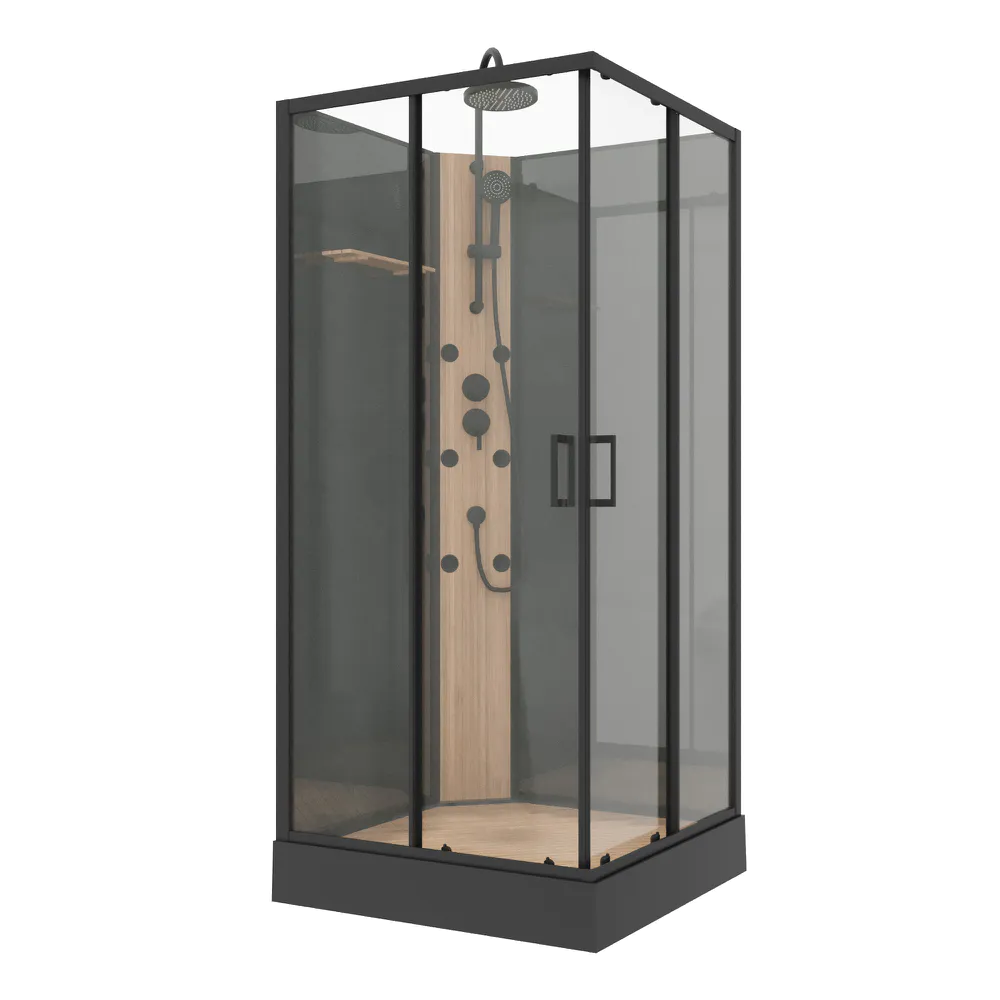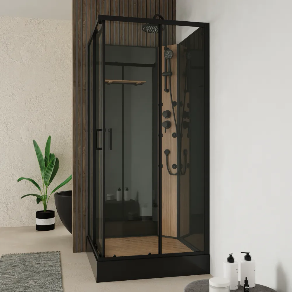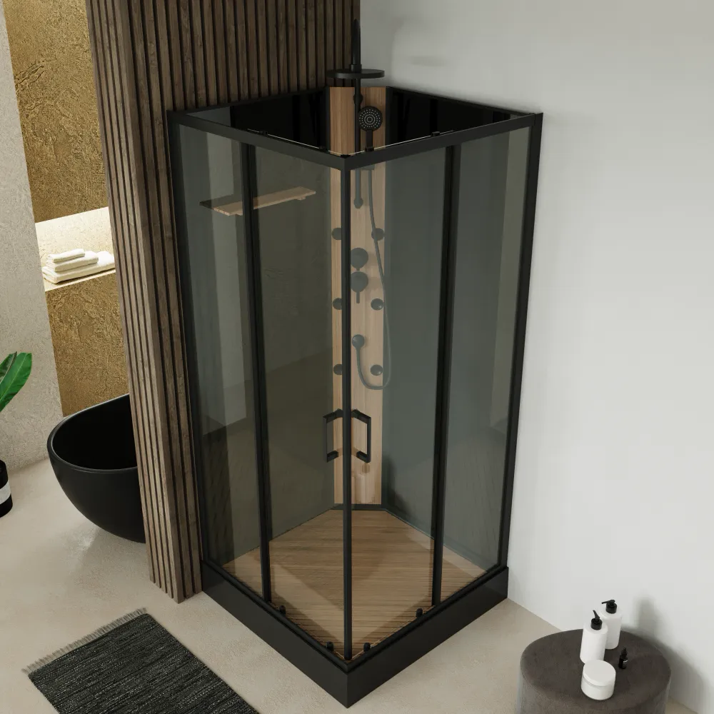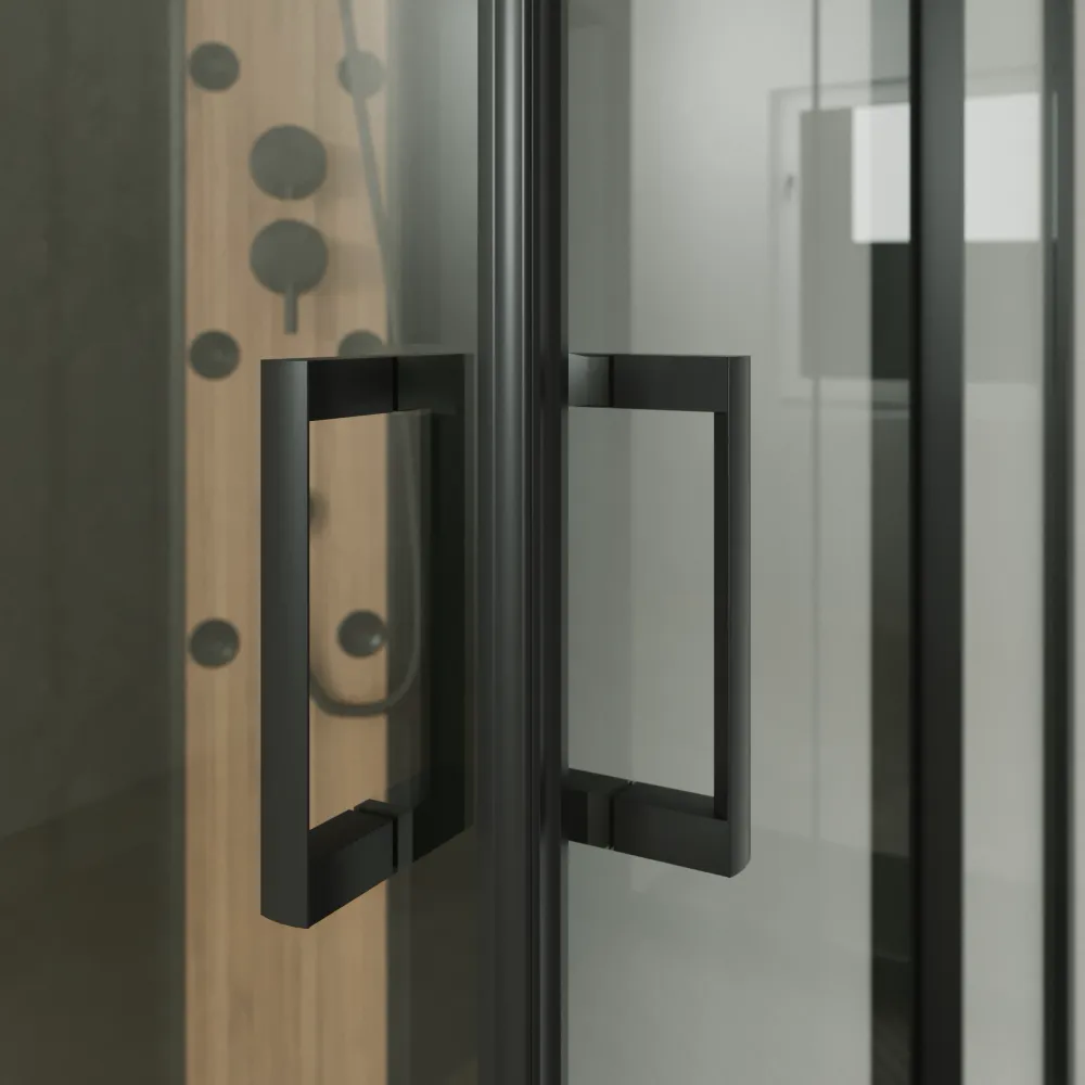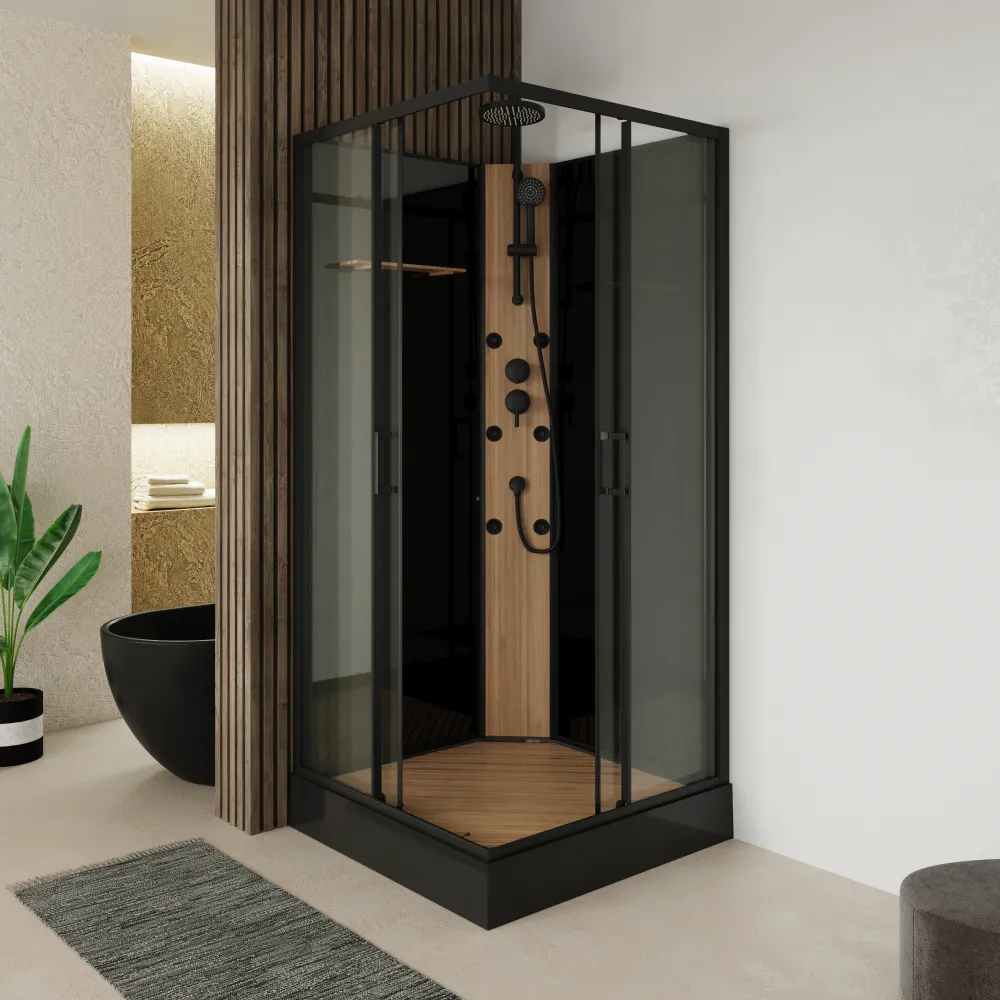Il box doccia idromassaggio Saba con dimensioni 90x90 cm combina design contemporaneo, materiali di qualità e funzionalità avanzate per trasformare la doccia quotidiana in un’esperienza di puro benessere. I profili neri conferiscono un aspetto moderno e deciso, mentre la porta e il pannello laterale in vetro trasparente da 5 mm assicurano luminosità e trasparenza. Il pannello posteriore in vetro nero verniciato da 4 mm completa l’estetica con un tocco elegante e sofisticato.
