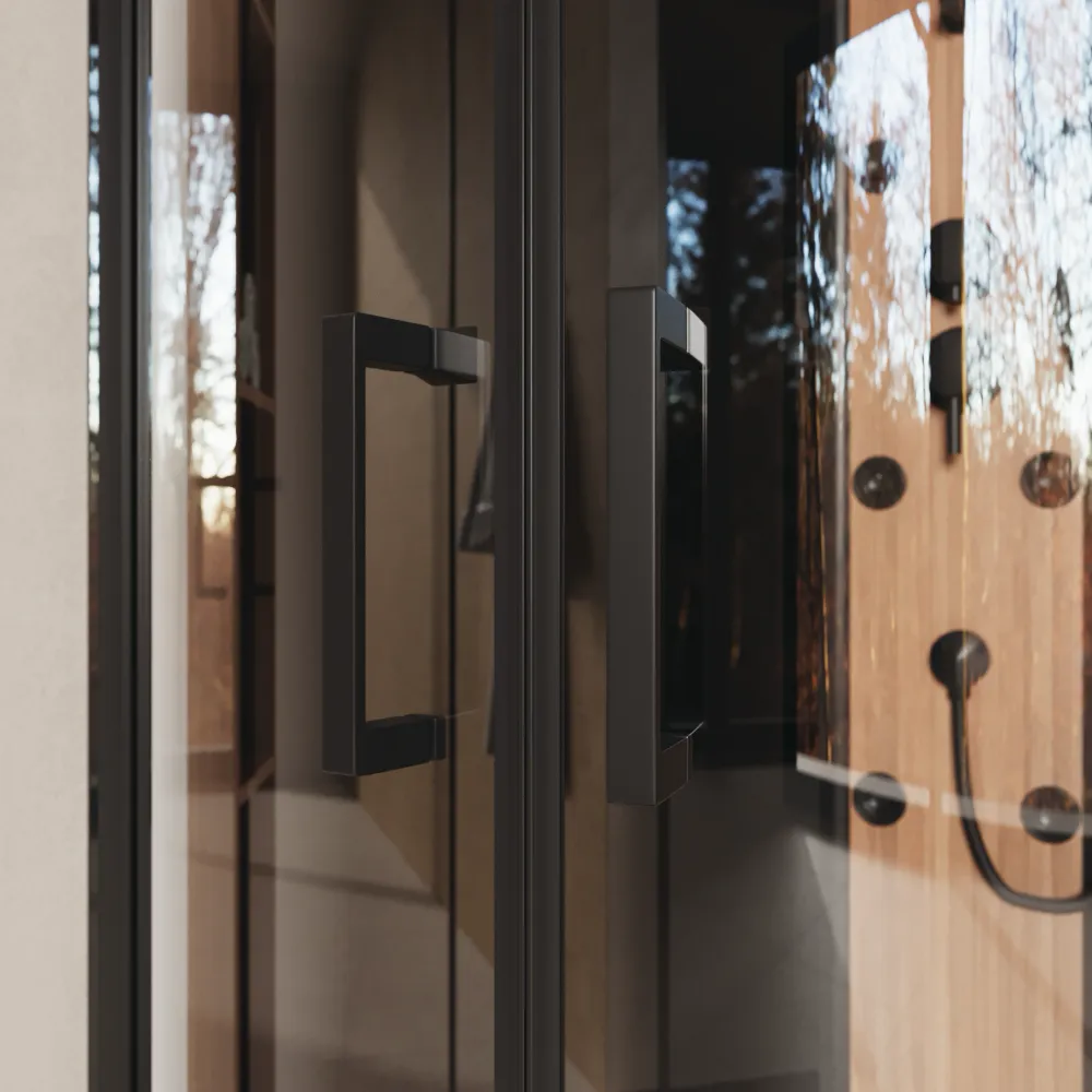 L’esperienza idromassaggio è studiata per essere avvolgente: il soffione superiore nero offre un getto ampio e rilassante, mentre la barra doccia e il doccino nero con flessibile in acciaio inox da 1,5 m offrono versatilità. I getti idromassaggio neri sono posizionati ergonomicamente per un massaggio mirato, e il miscelatore a 3 funzioni nero permette di selezionare facilmente soffione, doccino o getti idromassaggio.