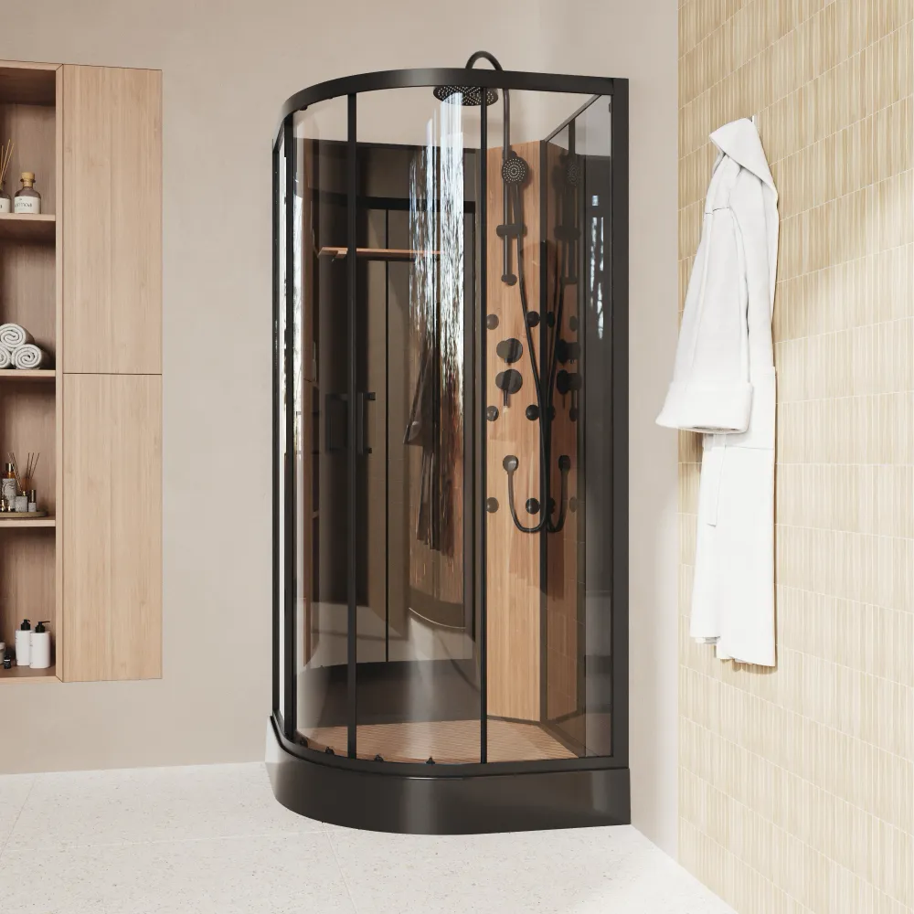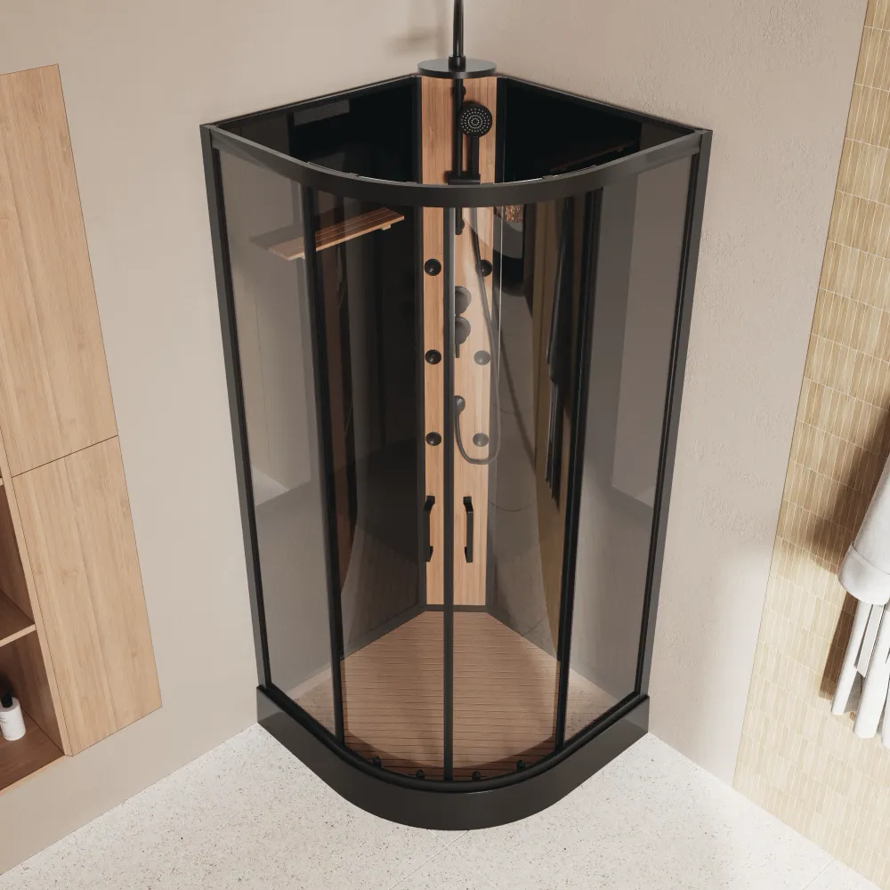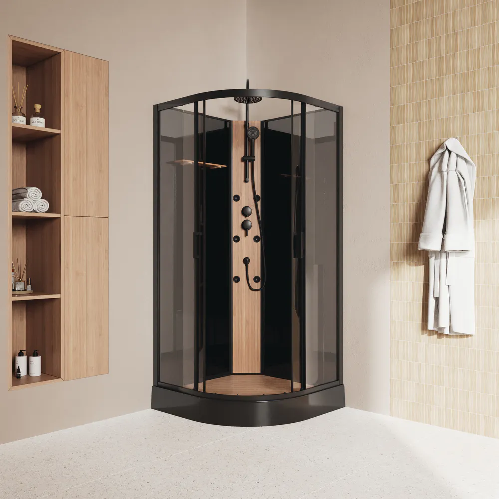 Il box doccia idromassaggio Brac semicircolare, dimensioni 90x90 cm, rappresenta la soluzione perfetta per un bagno moderno e raffinato, dove comfort e stile si incontrano. La struttura è caratterizzata da profili neri, eleganti e resistenti, che valorizzano il design semicircolare, mentre il vetro trasparente da 5 mm della porta e del pannello fisso garantisce trasparenza e luminosità. Il pannello posteriore in vetro nero verniciato da 4 mm conferisce un look sofisticato e contemporaneo, ideale per ambienti di design.