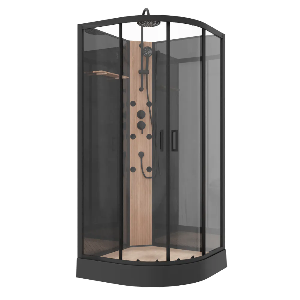 Il pannello funzionale in pannello composito in carbonio integra tutti i comandi idraulici in modo ergonomico, assicurando un’esperienza doccia intuitiva e completa. Il piatto doccia, alto 15 cm e realizzato in ABS nero, garantisce resistenza, facilità di pulizia e stabilità.