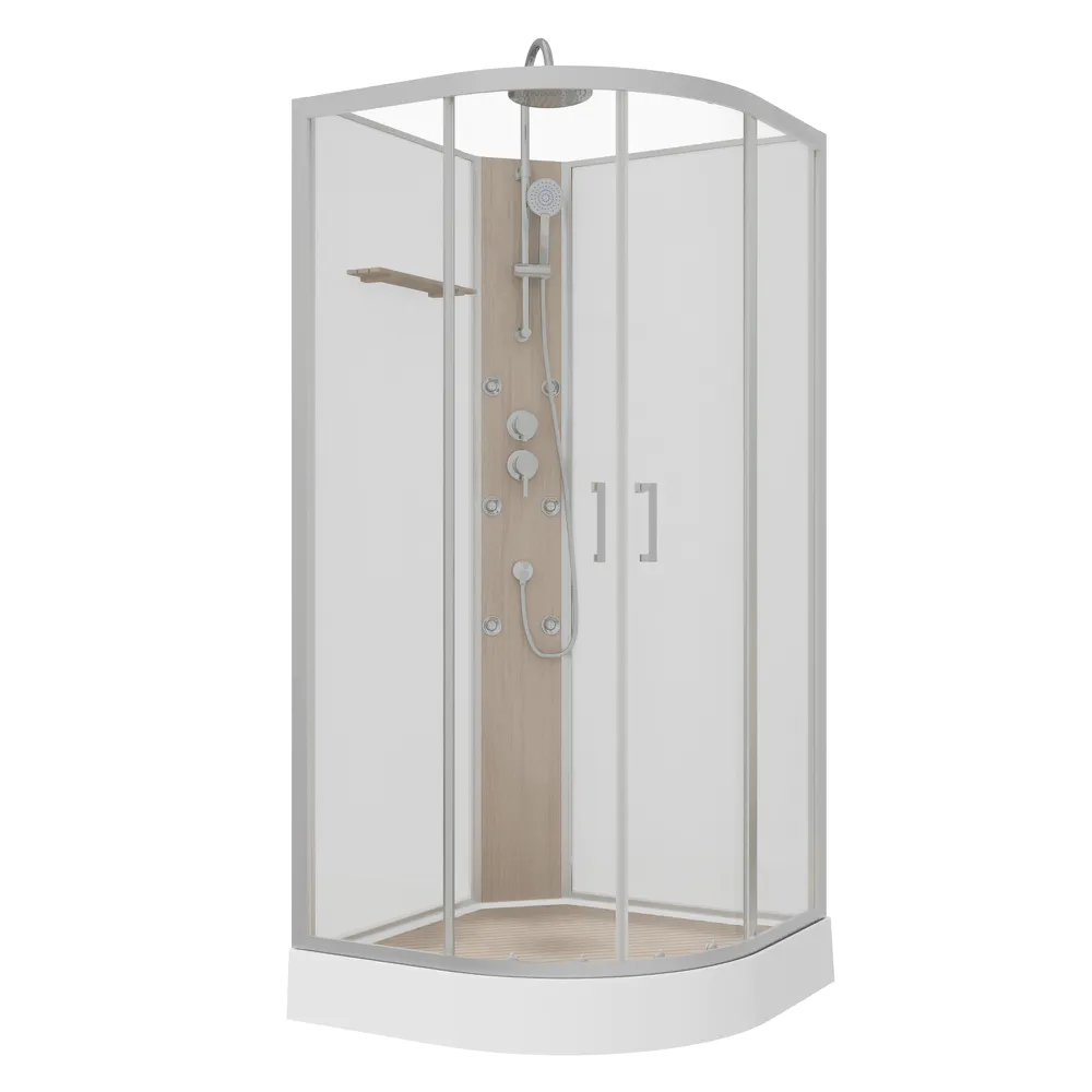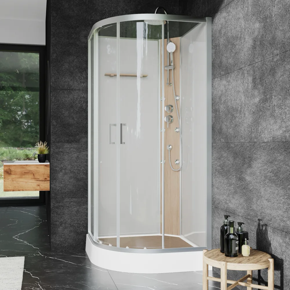 Il box doccia Pag semicircolare con dimensioni 90x90 cm porta l’esperienza della spa direttamente nel tuo bagno. I profili argentati donano un tocco moderno e raffinato, mentre la combinazione di vetri trasparenti da 5 mm per la porta e il pannello fisso e del vetro posteriore bianco verniciato da 4 mm crea un effetto luminoso ed elegante.