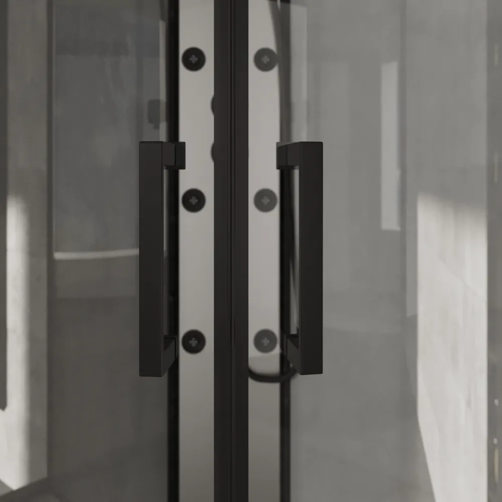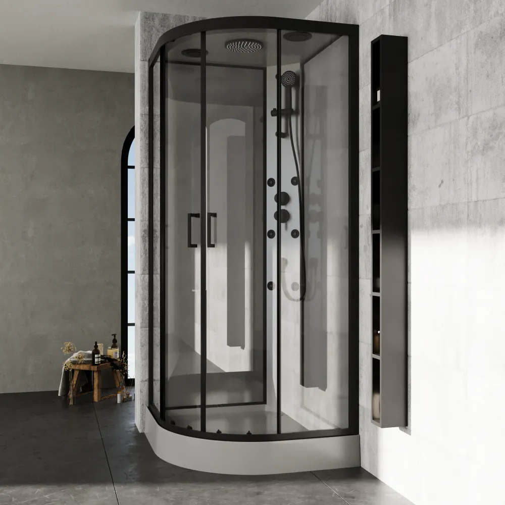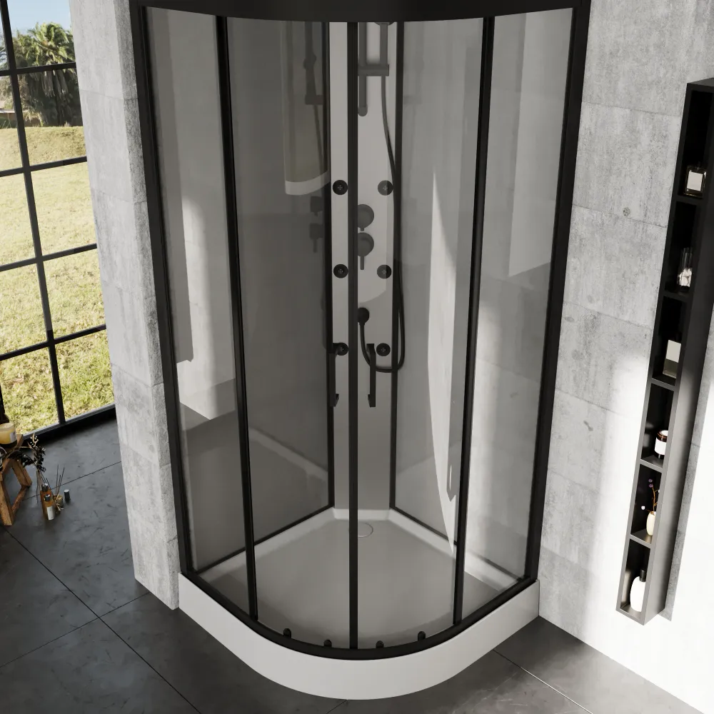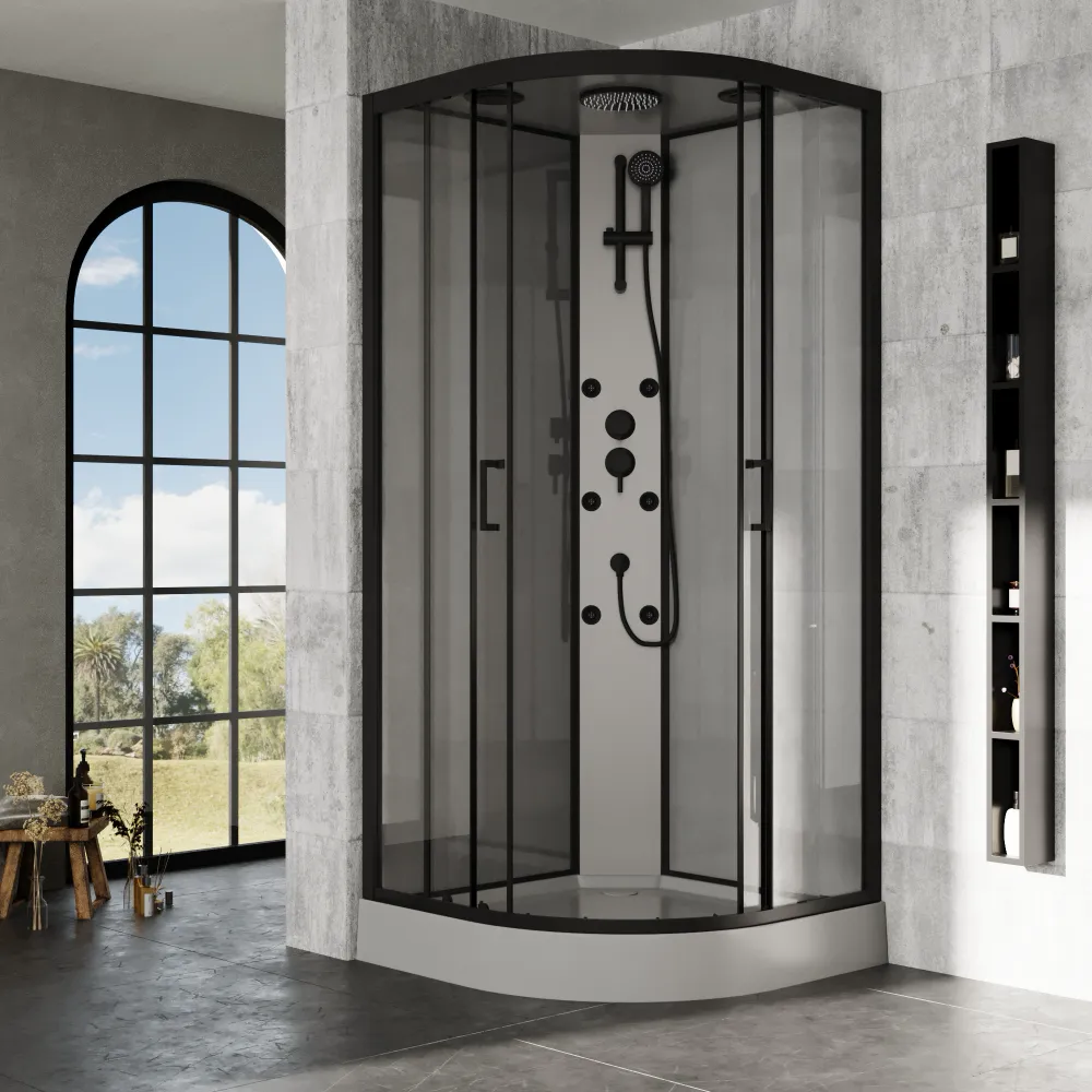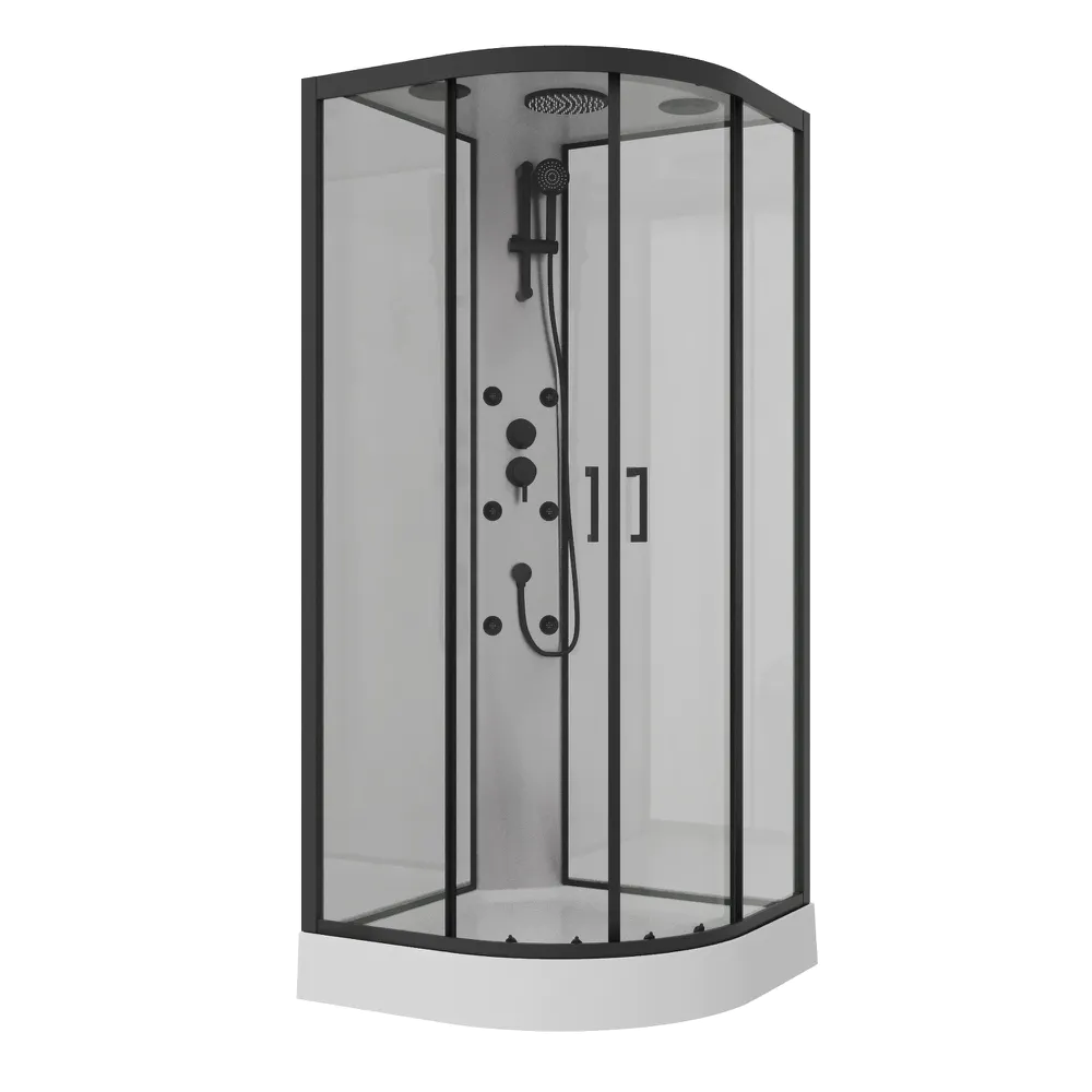 Il box doccia idromassaggio Sark semicircolare, con dimensioni 90x90 cm, unisce design sofisticato e funzionalità quotidiana. I profili neri conferiscono un aspetto moderno e deciso, mentre il vetro trasparente da 5 mm della porta e del pannello fisso lascia filtrare la luce, creando un ambiente arioso e luminoso. Il pannello posteriore in vetro grigio verniciato da 4 mm aggiunge profondità e raffinatezza, completato dal pannello funzionale in PVC grigio che ospita tutti i comandi in modo ergonomico.