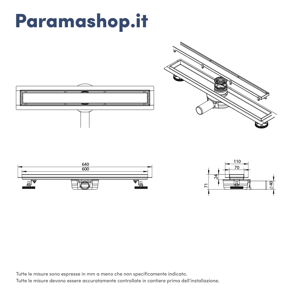 I piedini regolabili in altezza consentono un'installazione precisa e flessibile, adattando la canalina alle diverse condizioni del pavimento e garantendo una perfetta inclinazione per il corretto deflusso dell'acqua.