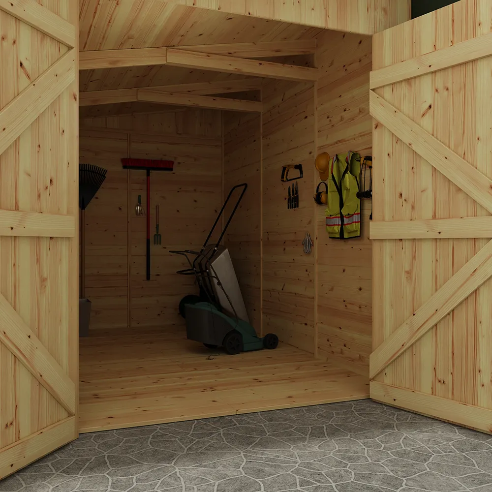 La struttura del deposito è composta da pannelli preassemblati in perline da 20 mm e un telaio interno da 32 x 32 mm, che ne assicurano la solidità. Il tetto è altrettanto robusto, con supporti in legno e timpani laterali.