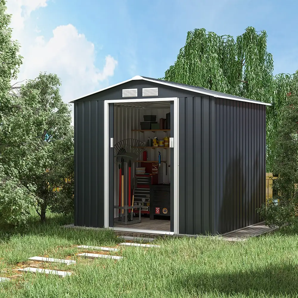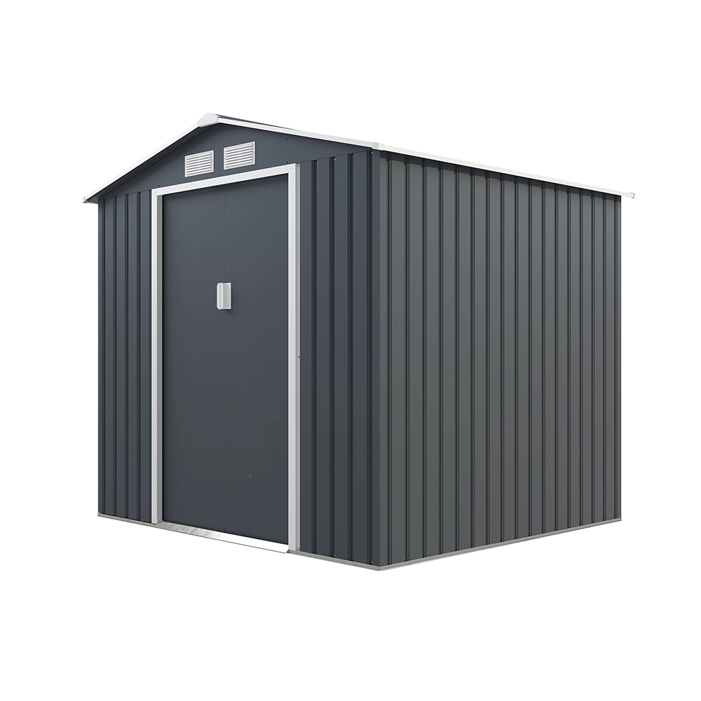 Le dimensioni di 2,13x1,91x1,95 m garantiscono un ampio spazio interno, mentre la porta a doppio scorrevole da 0,96x1,62 m permette un facile accesso anche per attrezzi ingombranti. Realizzato in lamiera preverniciata resistente alle intemperie, questo box in acciaio assicura una protezione efficace contro pioggia, vento e raggi UV. Le pareti hanno uno spessore di 0,25 mm, mentre la struttura portante varia tra 0,5 e 0,8 mm, garantendo solidità e durata nel tempo.