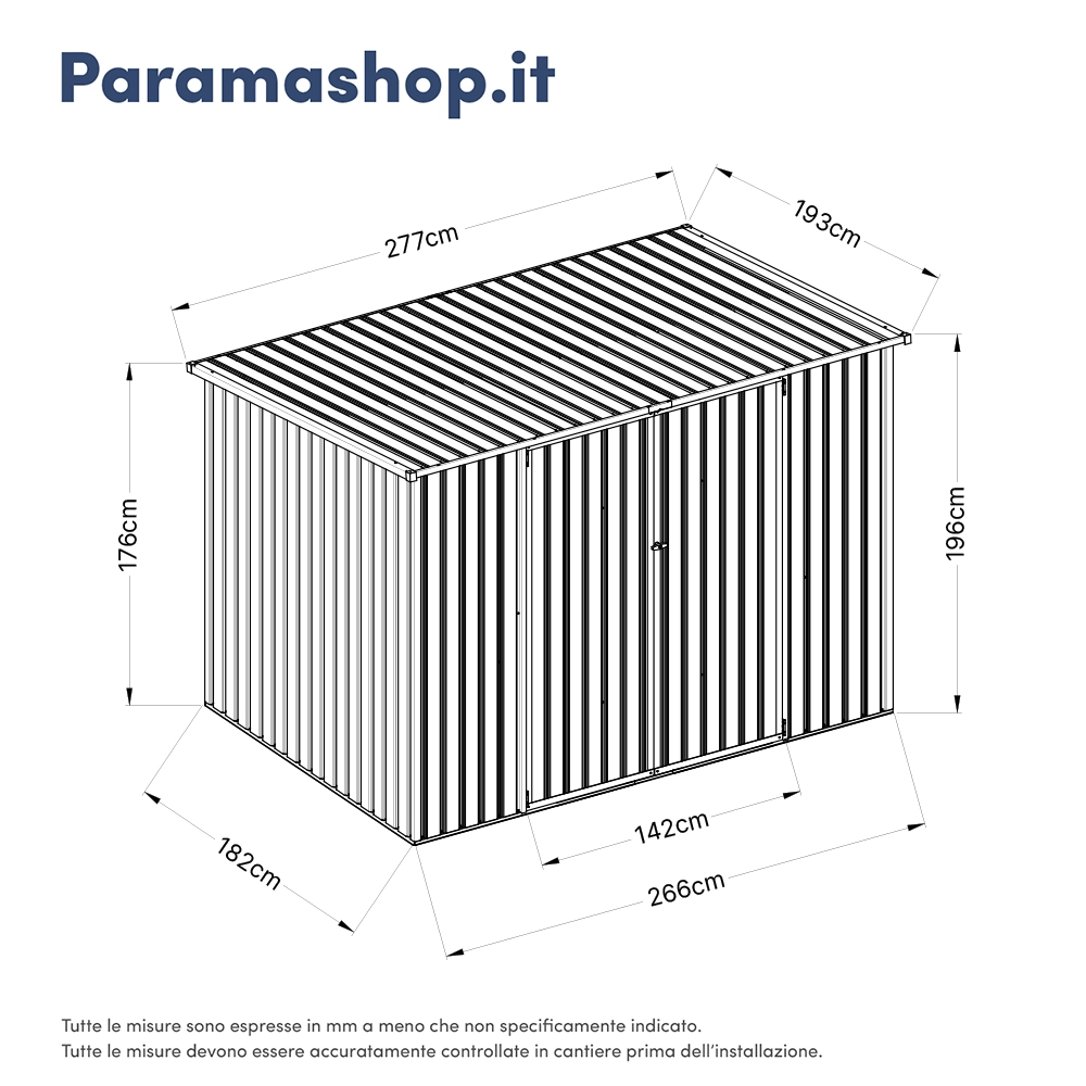 Le dimensioni esterne della casetta sono di 2.77m di lunghezza, 1.93m di larghezza e 1.96m di altezza, offrendo uno spazio ampio e funzionale. Con una superficie utile di 5,35m², la casetta è perfetta per soddisfare le tue necessità di stoccaggio senza occupare troppo spazio nel giardino.