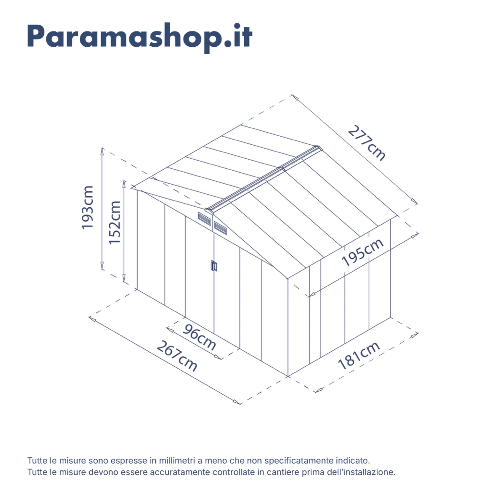 Le dimensioni esterne del capanno sono di 2,77 m di lunghezza, 1,95 m di profondità e 1,92 m di altezza, mentre lo spazio interno misura 2,67 m × 1,81 m × 1,92 m, per una superficie utile di circa 4,8 m². L’altezza delle pareti è pari a 1,55 m. Grazie a queste proporzioni, il box offre spazio sufficiente per riporre macchinari, attrezzi e accessori, mantenendoli sempre protetti e facilmente accessibili.
