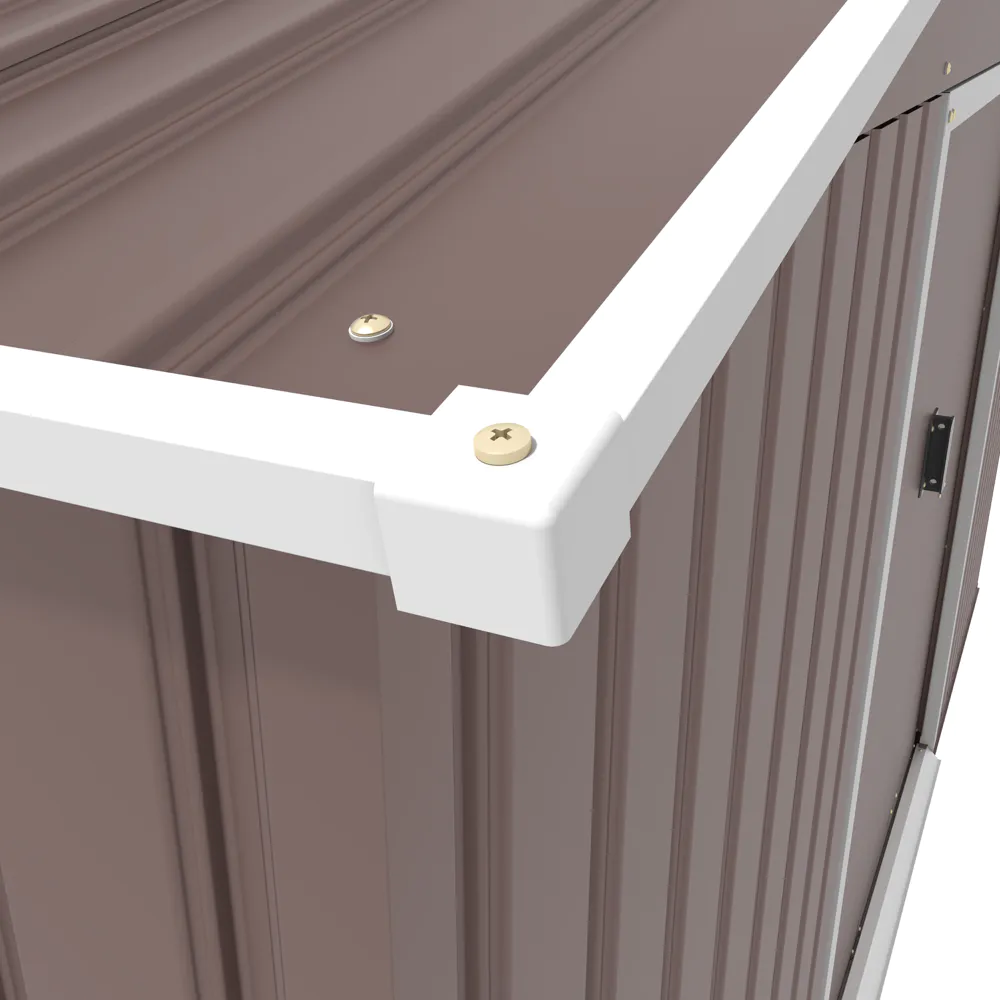 Il design è ampio e ben ventilato grazie a quattro prese d’aria che favoriscono il ricambio e mantengono l’interno asciutto e luminoso. Il tetto inclinato è studiato per impedire l’accumulo di acqua piovana, mentre le doppie porte scorrevoli consentono un ingresso largo e comodo anche per oggetti voluminosi. L’estetica pulita è valorizzata dal colore marrone, che si integra con facilità in giardini, cortili e altri spazi all’aperto.