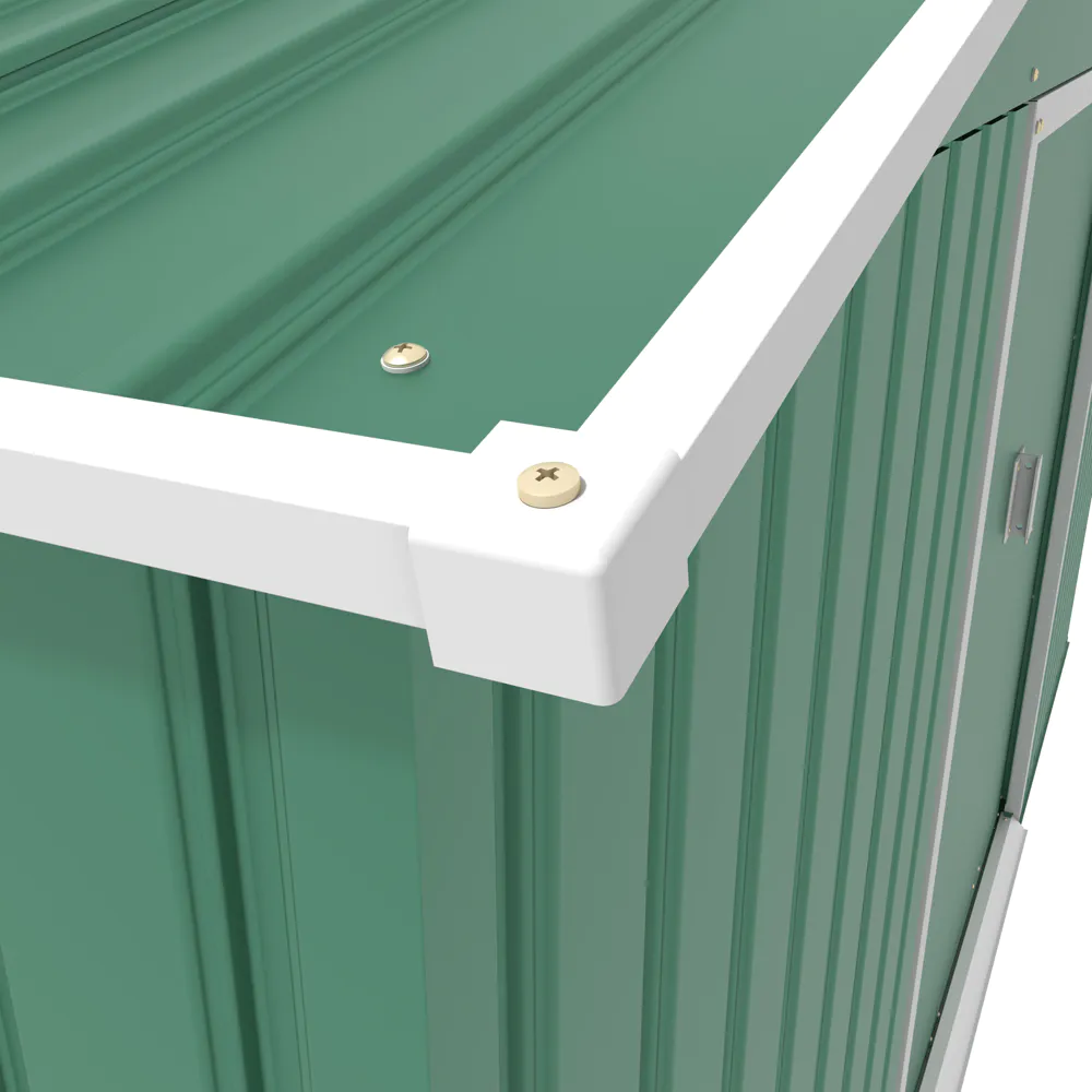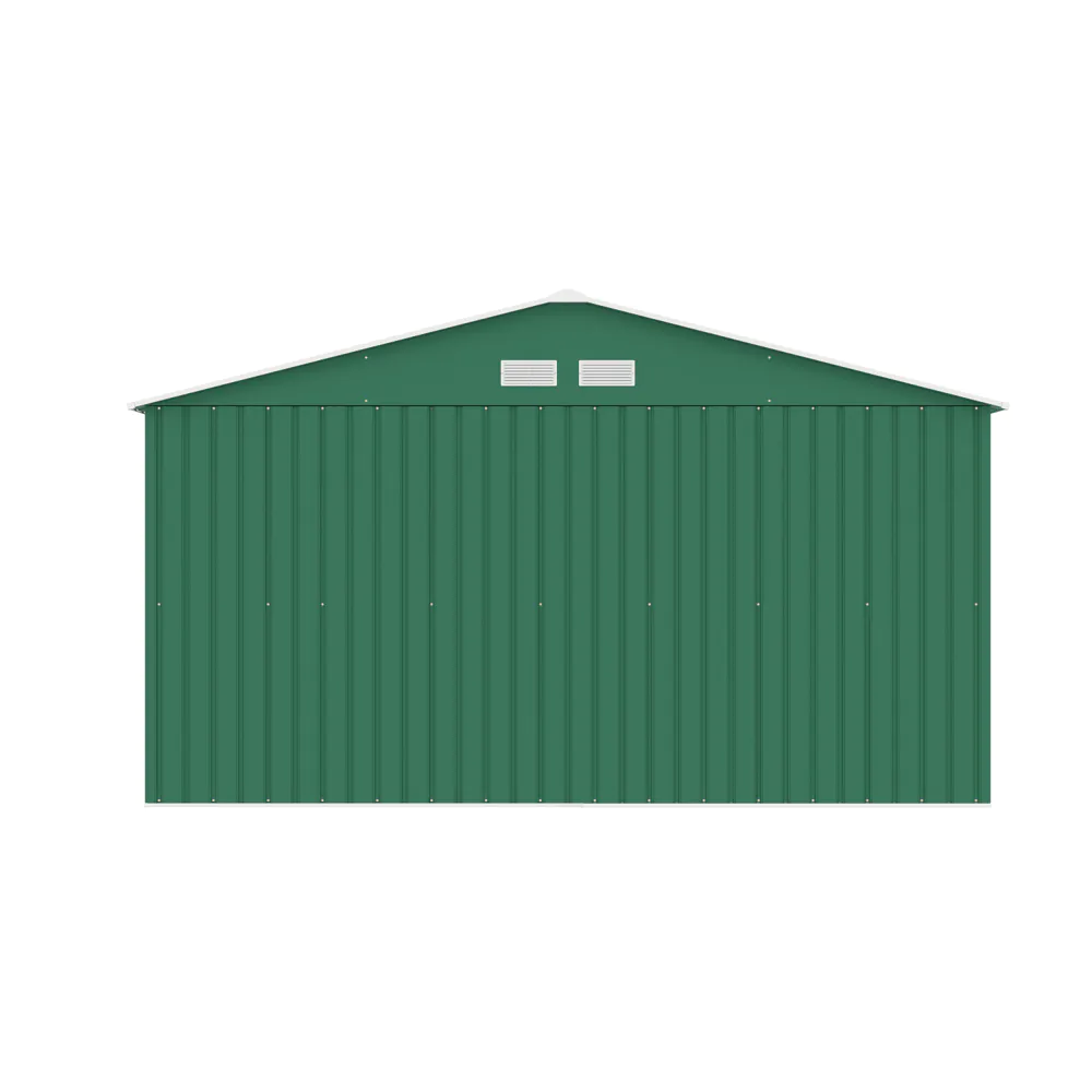Il design è ampio e ben ventilato grazie a quattro prese d’aria che favoriscono il ricambio e mantengono l’interno asciutto e luminoso. Il tetto inclinato è studiato per impedire l’accumulo di acqua piovana, mentre le doppie porte scorrevoli consentono un ingresso largo e comodo anche per oggetti voluminosi. L’estetica pulita è valorizzata dal colore verde scuro, che si integra con facilità in giardini, cortili e altri spazi all’aperto.