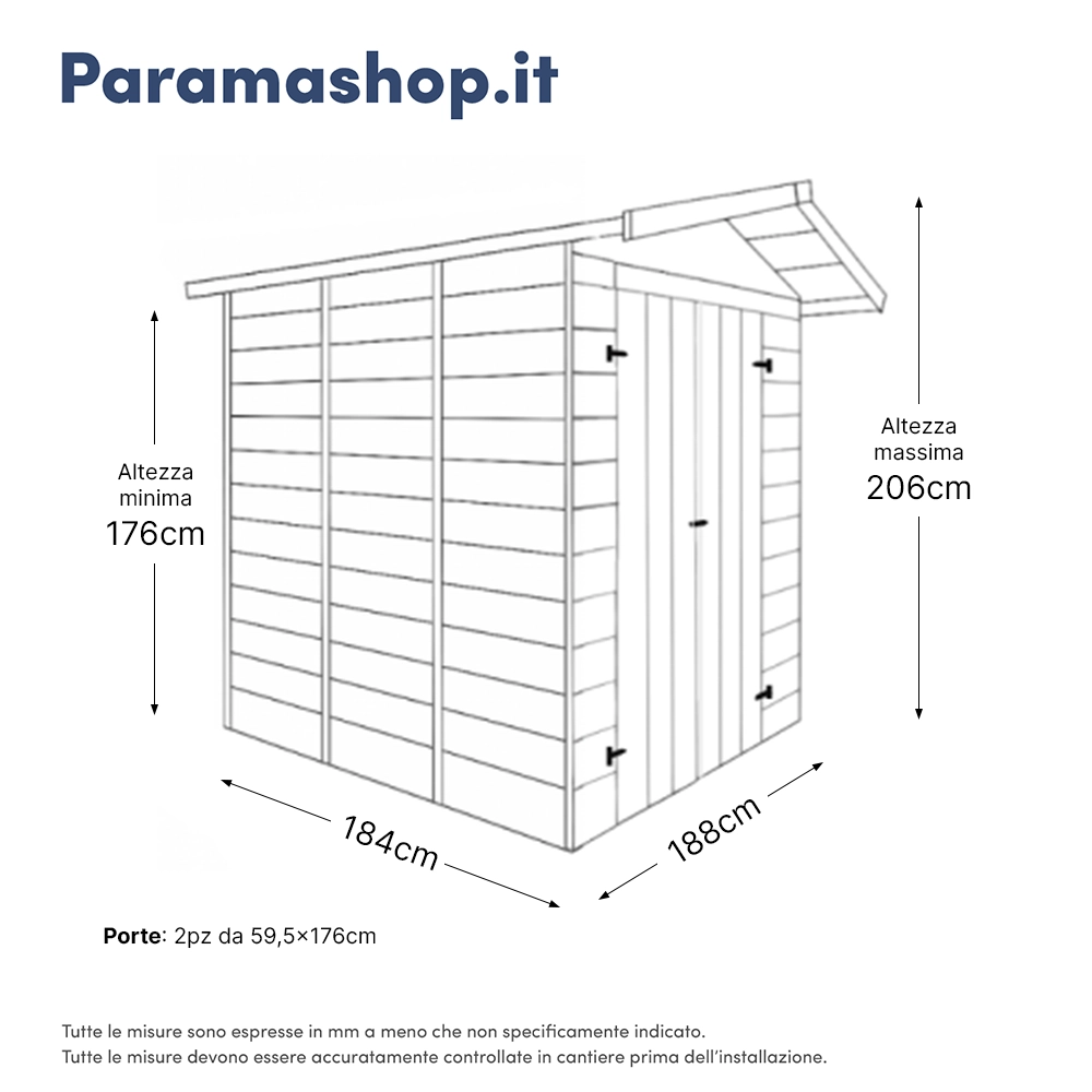 L’accesso alla casetta è facilitato da una doppia porta, ciascuna con dimensioni di 0,59 x 1,76 m, pratica per introdurre facilmente anche oggetti voluminosi.