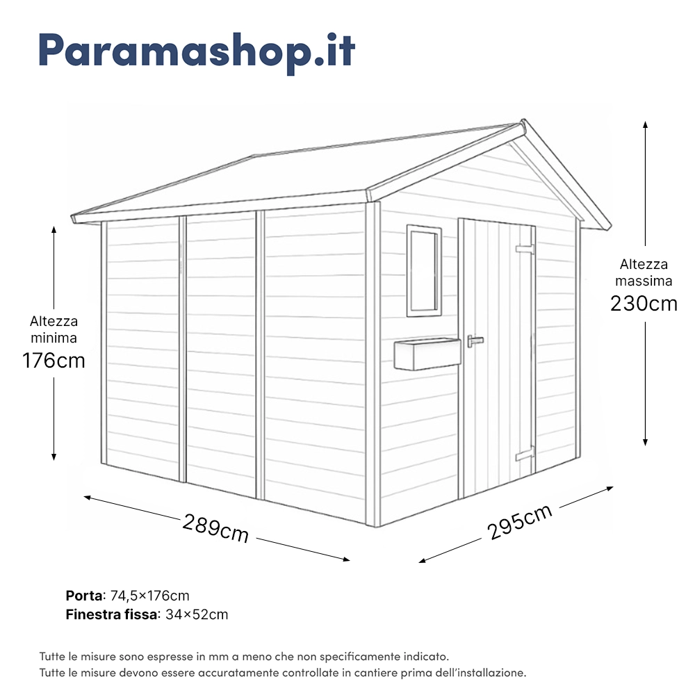 La struttura è progettata per offrire grande funzionalità, con un’altezza laterale di 1,76 m e un’altezza massima al colmo del tetto di 2,30 m. La porta, dalle dimensioni di 0,74 x 1,76 m, è facilmente accessibile e consente un comodo ingresso. Inoltre, la casetta è dotata di una finestra fissa delle dimensioni di 34x52cm, che garantisce una maggiore luminosità all'interno.