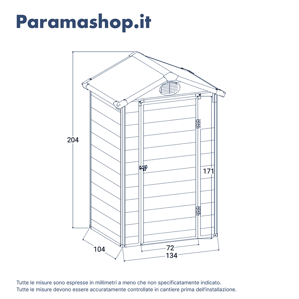 Grazie alla presenza di due aperture per la ventilazione, l’interno della casetta porta attrezzi rimane sempre areato, evitando la formazione di umidità o muffe. Inoltre, la finestra laterale in policarbonato compatto trasparente lascia filtrare la luce naturale, rendendo più agevole la ricerca e l’organizzazione degli strumenti all’interno. La porta battente, di 0,72x1,71 m, è dotata di chiavistello di chiusura e di cerniere in metallo, assicurando maggiore sicurezza e solidità.