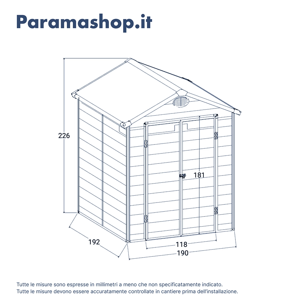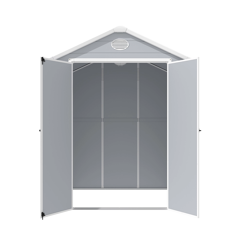 Grazie alla presenza di due aperture per la ventilazione, l’interno della casetta porta attrezzi rimane sempre areato, evitando la formazione di umidità o muffe. Inoltre, la finestra laterale in policarbonato compatto trasparente lascia filtrare la luce naturale, rendendo più agevole la ricerca e l’organizzazione degli strumenti all’interno. La porta battente, di 1.18x1.81 m, è dotata di chiavistello di chiusura e di cerniere in metallo, assicurando maggiore sicurezza e solidità.