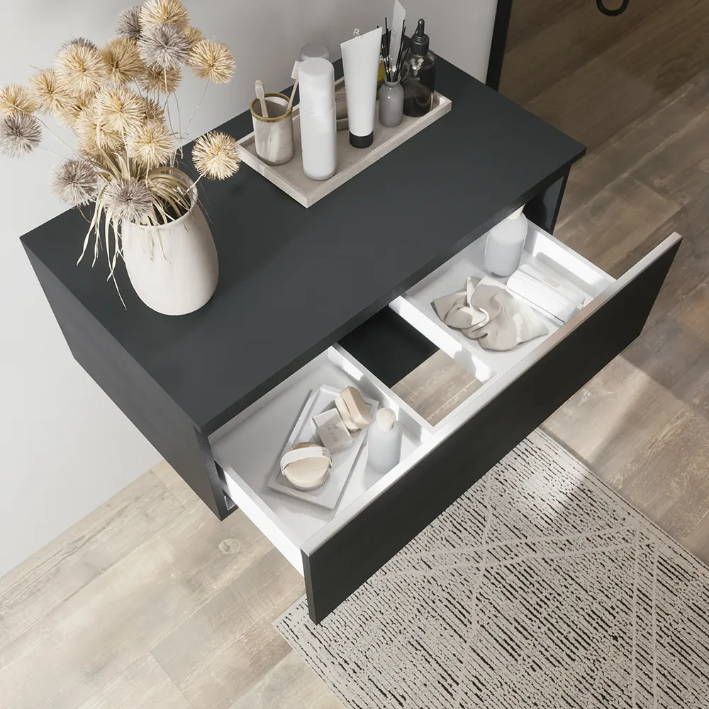 Con la sua installazione sospesa, il mobile da 80 cm regala leggerezza e ariosità all'ambiente, facilitando le pulizie del pavimento e creando un'estetica moderna e minimale. La finitura color antracite lo rende estremamente versatile, adattandosi con facilità a qualsiasi stile d'arredo, dal classico al contemporaneo.