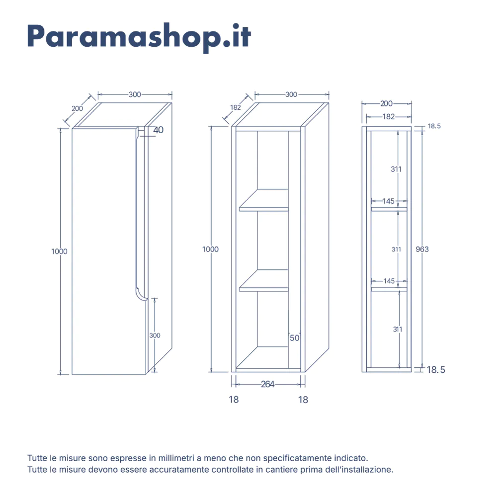 Realizzata in MDF di alta qualità con spessore da 18 mm e finitura in film PVC, garantisce resistenza all’umidità e lunga durata nel tempo. Il pannello posteriore e i ripiani interni removibili sono realizzati in materiale da 15 mm con rivestimento in melaminico, per una struttura solida e pratica nell’uso quotidiano.