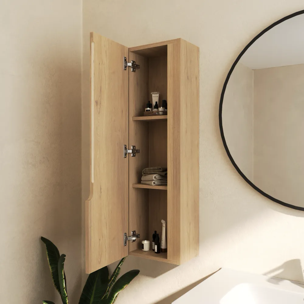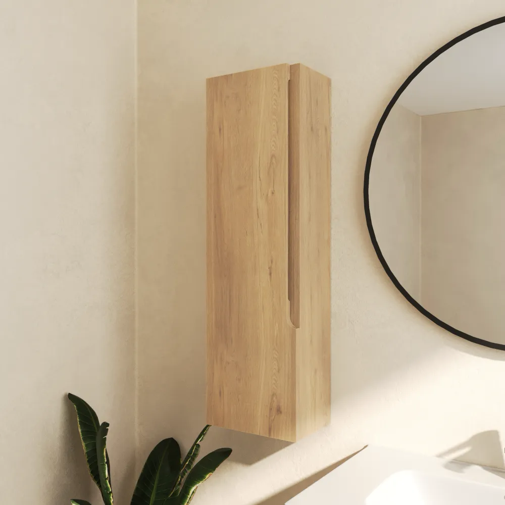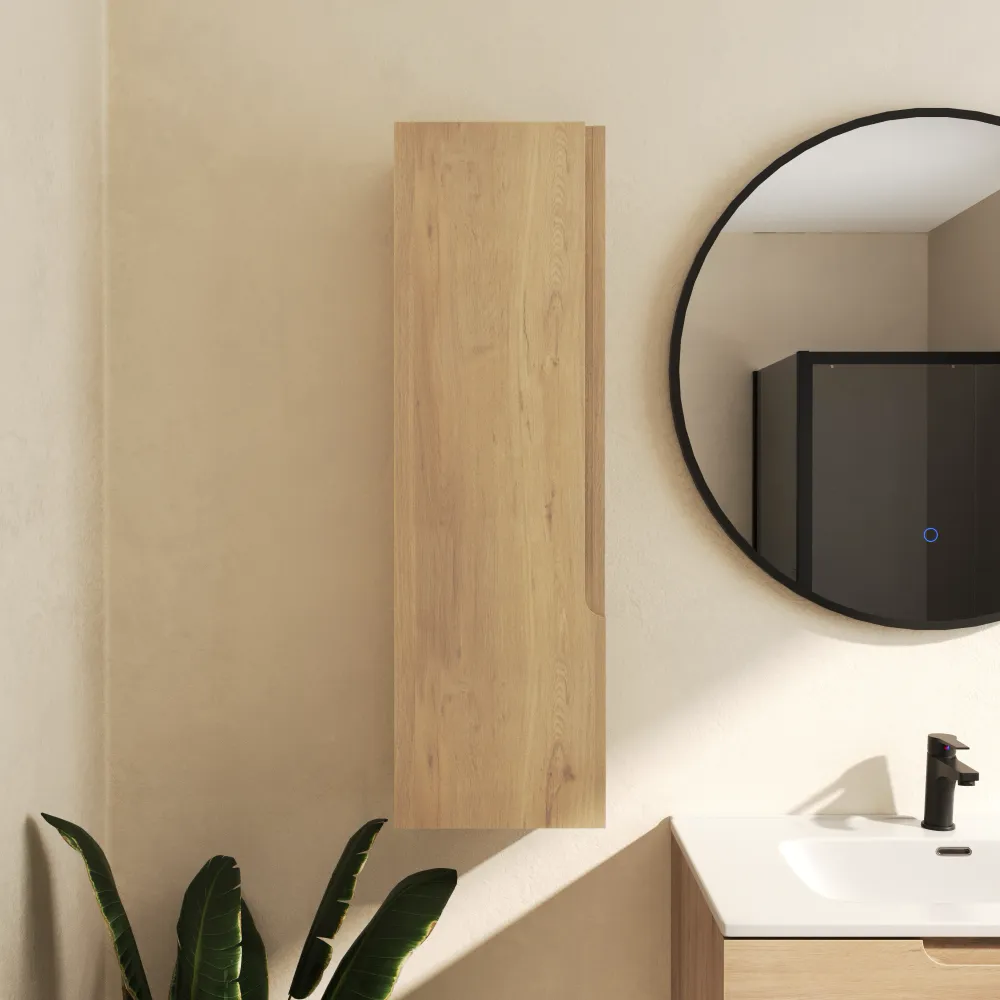 La colonna bagno sospesa Berg 100x30x20 cm in rovere chiaro unisce eleganza e funzionalità, offrendo uno spazio contenitivo aggiuntivo dal design essenziale e moderno.