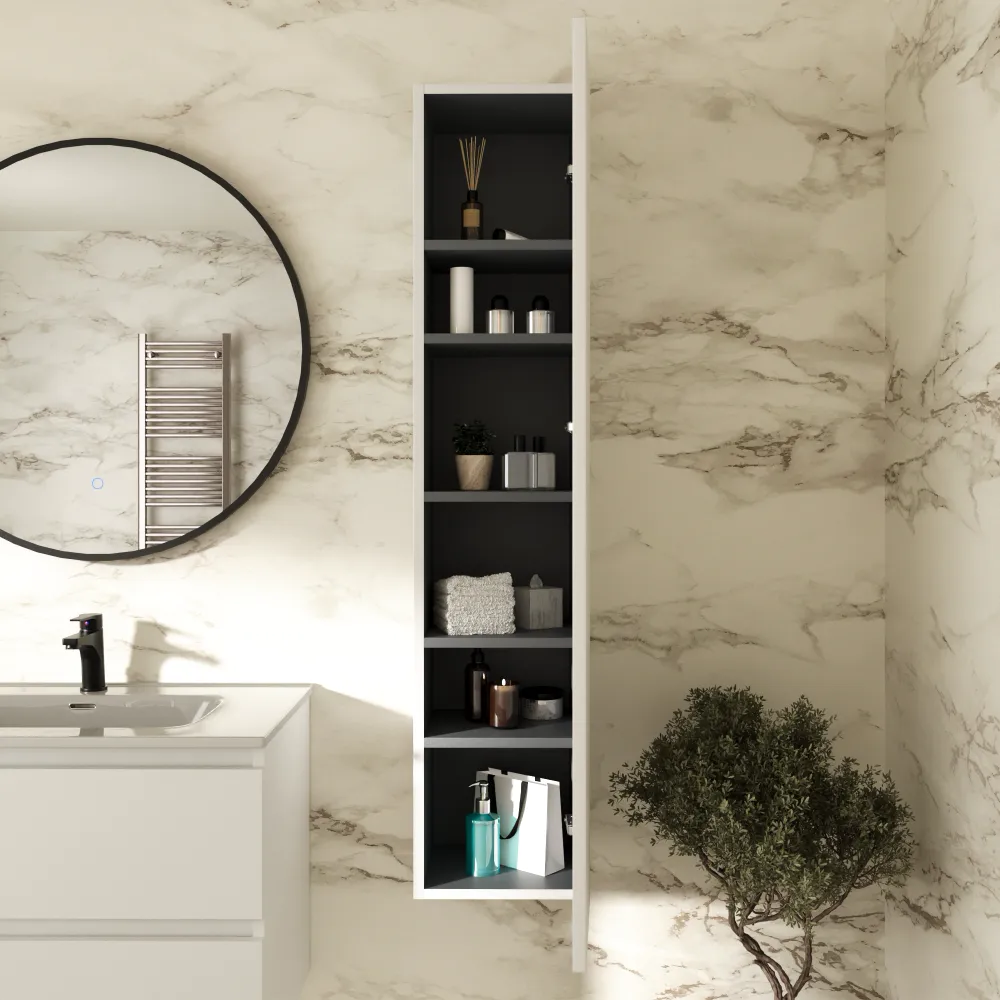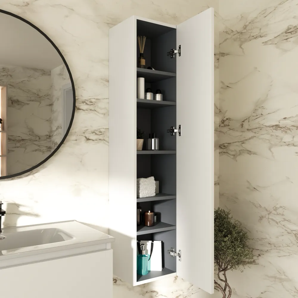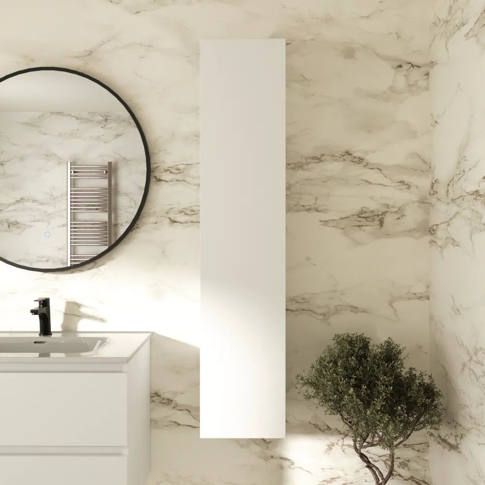 Le sue dimensioni ottimizzate – altezza 140 cm, larghezza 30 cm e profondità 20 cm – consentono di sfruttare anche gli spazi più ridotti senza rinunciare alla capienza. Il design verticale e snello valorizza l’ambiente, mentre la finitura bianco opaco aggiunge una nota distintiva e sofisticata, ideale per chi cerca un mobile bagno elegante e di forte impatto estetico.