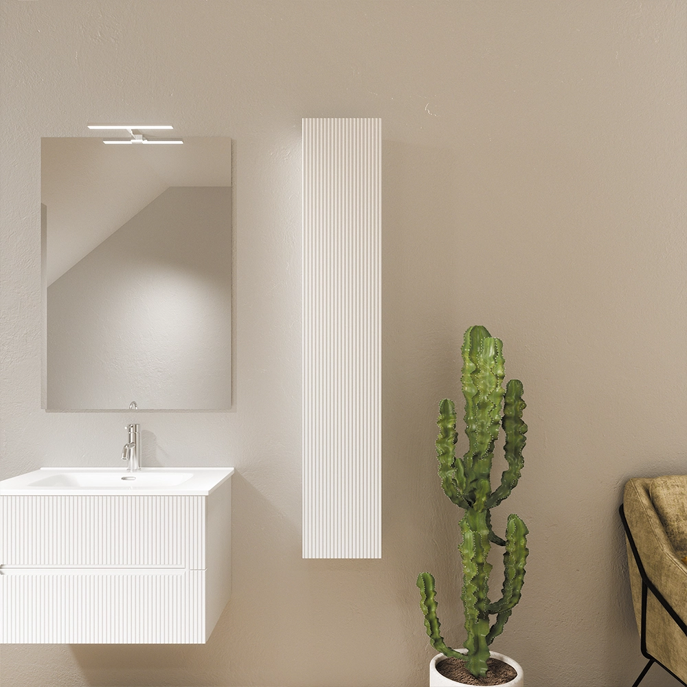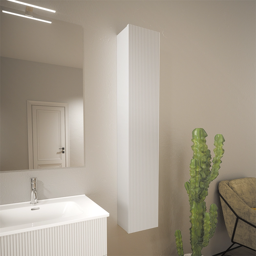 La colonna è realizzata in legno MDF con effetto cannettato di colore bianco opaco, è preassemblata ed include il set di viteria per l'installazione a muro. E' disponibile in 3 differenti colorazioni per offrirti la migliore possibilità di scelta e di accostamento con lo stile del tuo bagno.