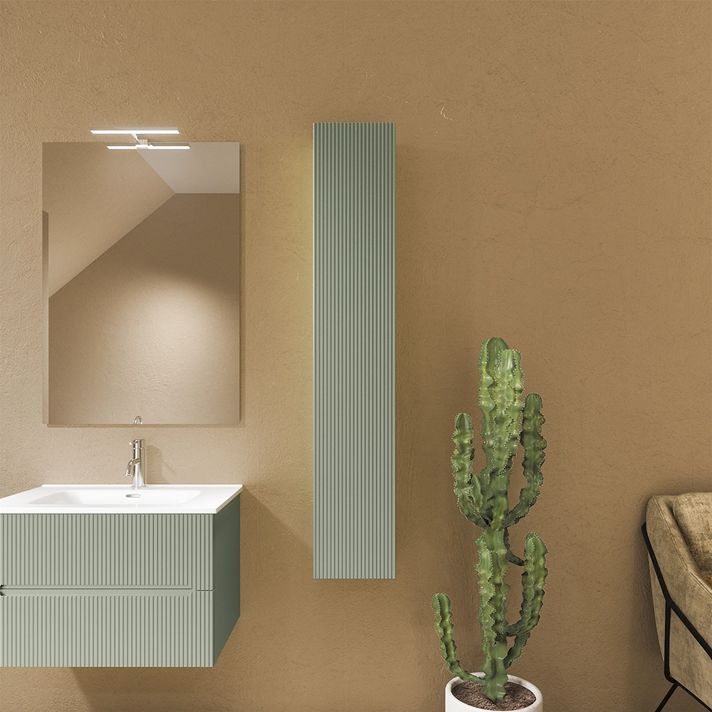 La colonna è realizzata in legno MDF con effetto cannettato di colore verde opaco, è preassemblata ed include il set di viteria per l'installazione a muro. E' disponibile in 3 differenti colorazioni per offrirti la migliore possibilità di scelta e di accostamento con lo stile del tuo bagno.