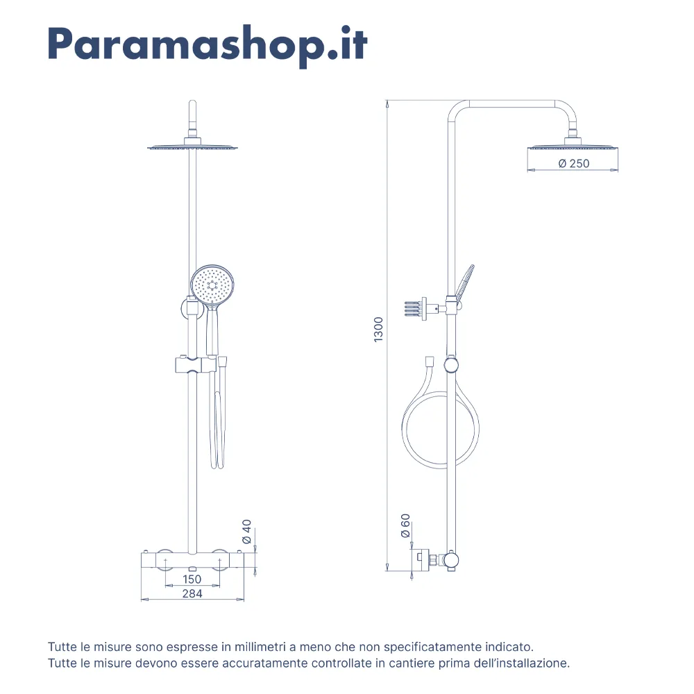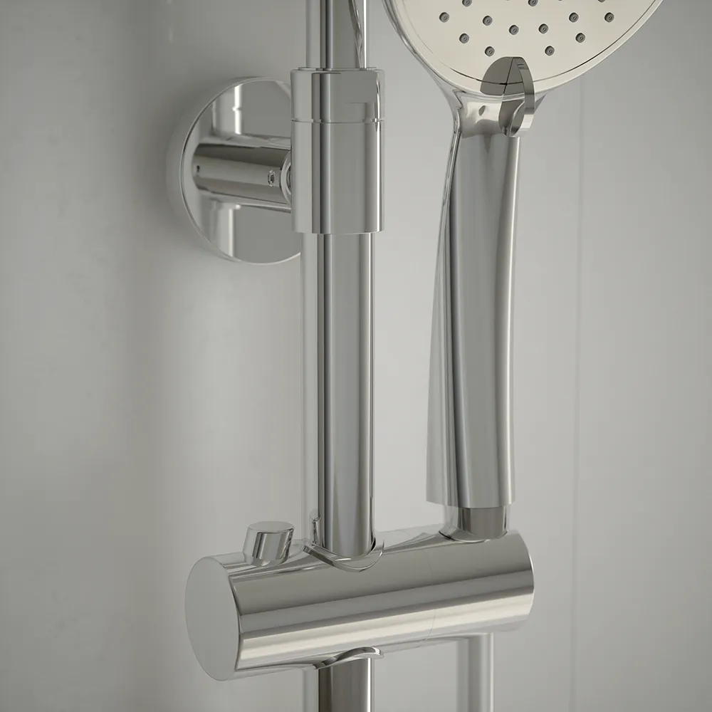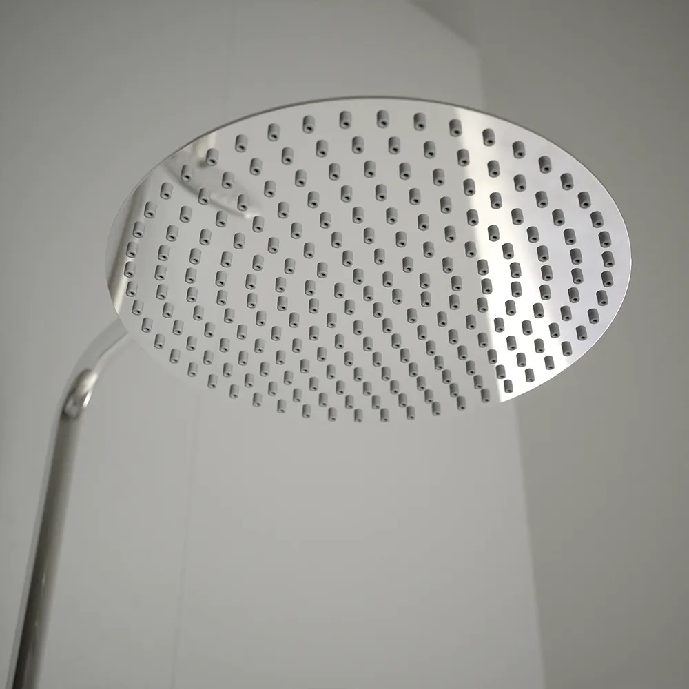 La colonna doccia include una barra scorrevole rotonda in acciaio inox che consente di regolare facilmente l’altezza della doccetta. Il soffione superiore, con un diametro di 25 cm e realizzato in acciaio inox, eroga un getto ampio e uniforme, perfetto per un momento di relax. Il doccino in ABS è leggero, funzionale e facile da maneggiare, mentre il flessibile in PVC da 1,5 metri garantisce libertà di movimento e praticità nella pulizia.