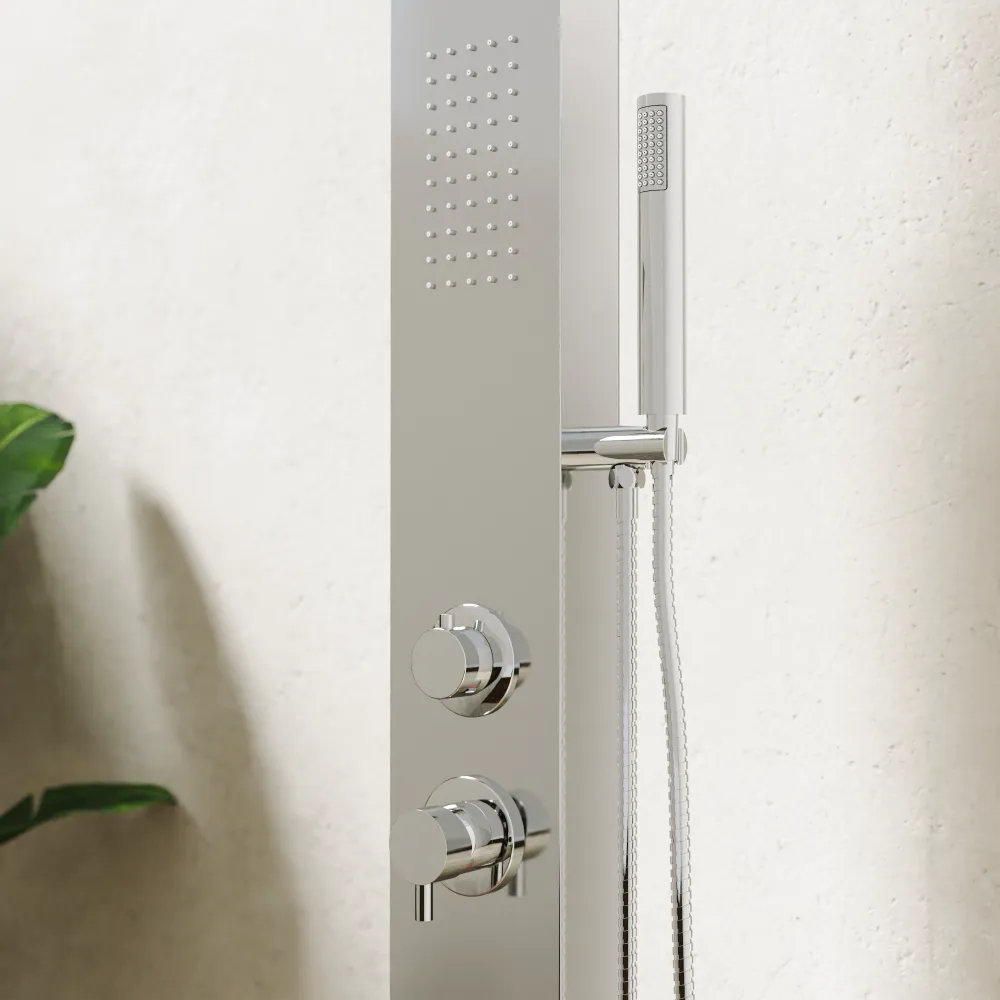 La colonna è equipaggiata con un corpo rubinetto in ottone di alta qualità, completo di miscelatore per acqua calda e fredda, che garantisce un controllo preciso della temperatura e un’elevata affidabilità nel tempo.