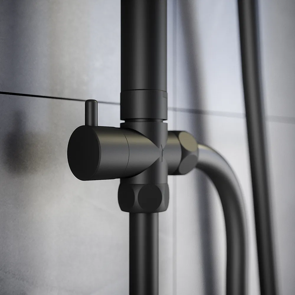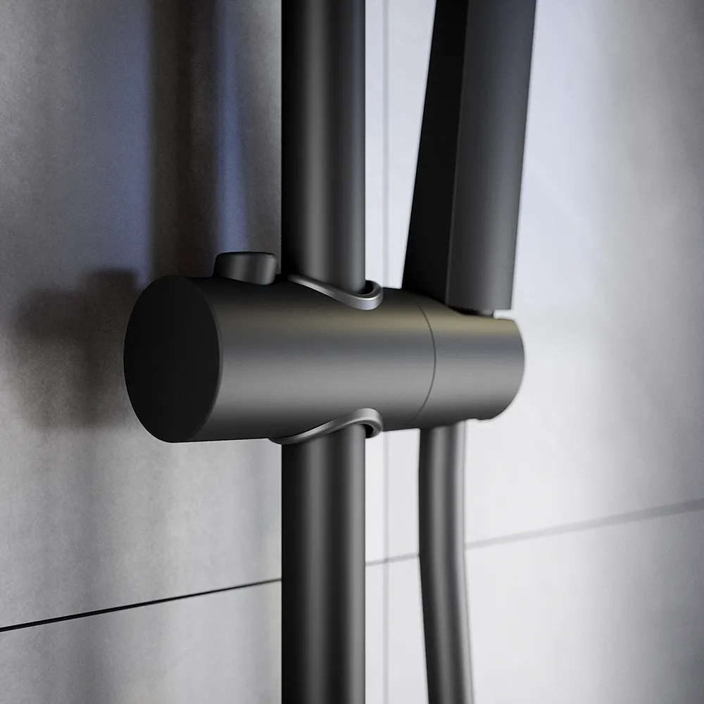 Con un elegante finitura nera opaca perfetta per qualsiasi stile di arredo bagno, questo sistema doccia a due vie comprende un soffione quadrato in ABS della misura di 20x20cm ed un comodo doccino in ABS nero opaco monofunzione per la massima libertà di azione all'interno del tuo spazio doccia.