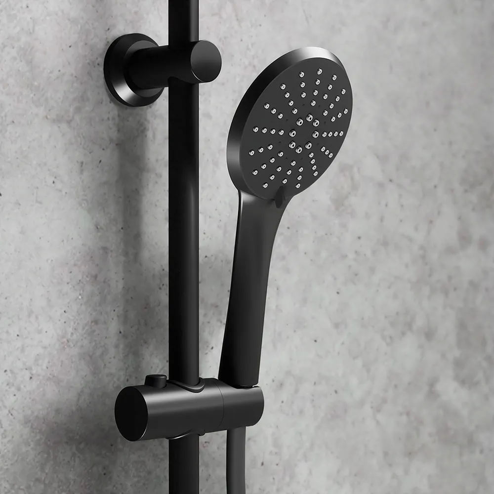 Questo splendido sistema doccia completo con attacco a parete ha uno stile contemporaneo e moderno ed è caratterizzato da un soffione doccia dal diametro di 23cm e da un doccino tre getti con altezza regolabile, un'elegante finitura nera opaca e ugelli in silicone.
