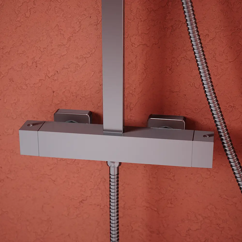 Serio è un kit estremamente completo per la tua doccia. Viene fornito con un pratico miscelatore in ottone cromato, dotato di deviatore e di controlli di flusso e temperatura dell'acqua, che permette un mantenimento costante della temperatura, proteggendoti da fastidiosi sbalzi di calore.