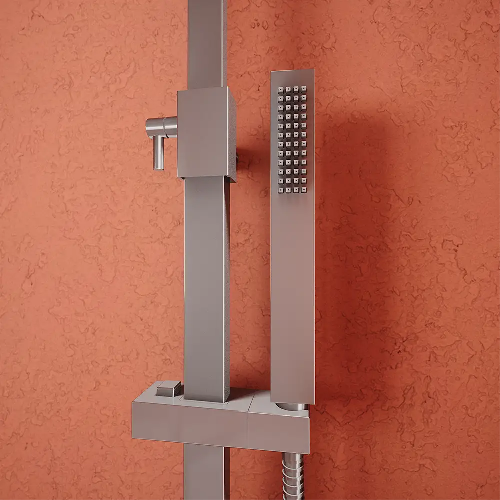La colonna doccia Serio è inoltre dotata di tutto il necessario alla tua routine di benessere quotidiano. Include un ampio soffione in ABS cromato da 20,5x20,5 cm ed una doccetta ad una funzione comprensiva del flessibile in acciaio inox da 150 cm.