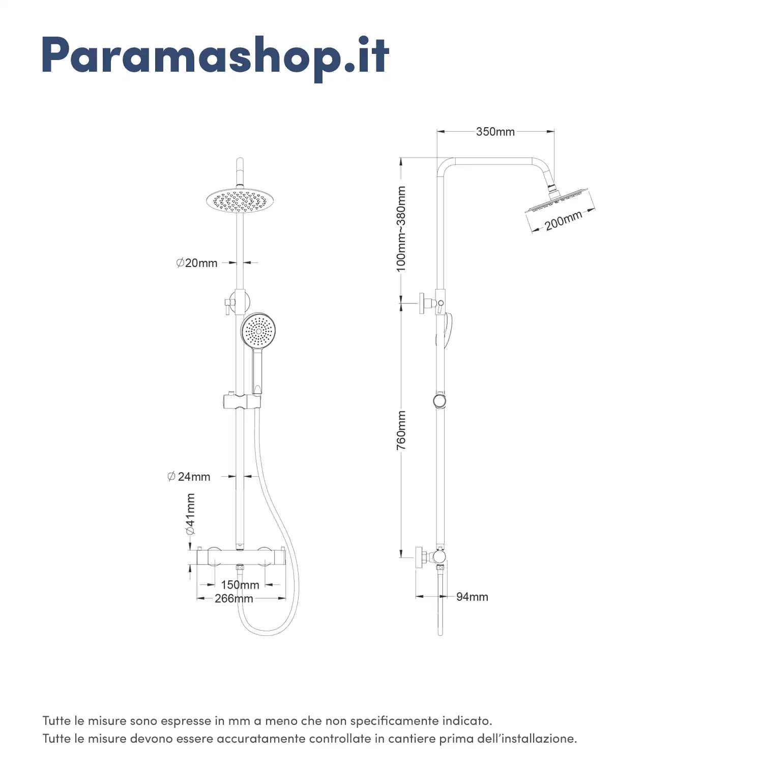 Colonna doccia in acciaio cromato con miscelatore e soffione ultraslim da 20 cm mod. Liri