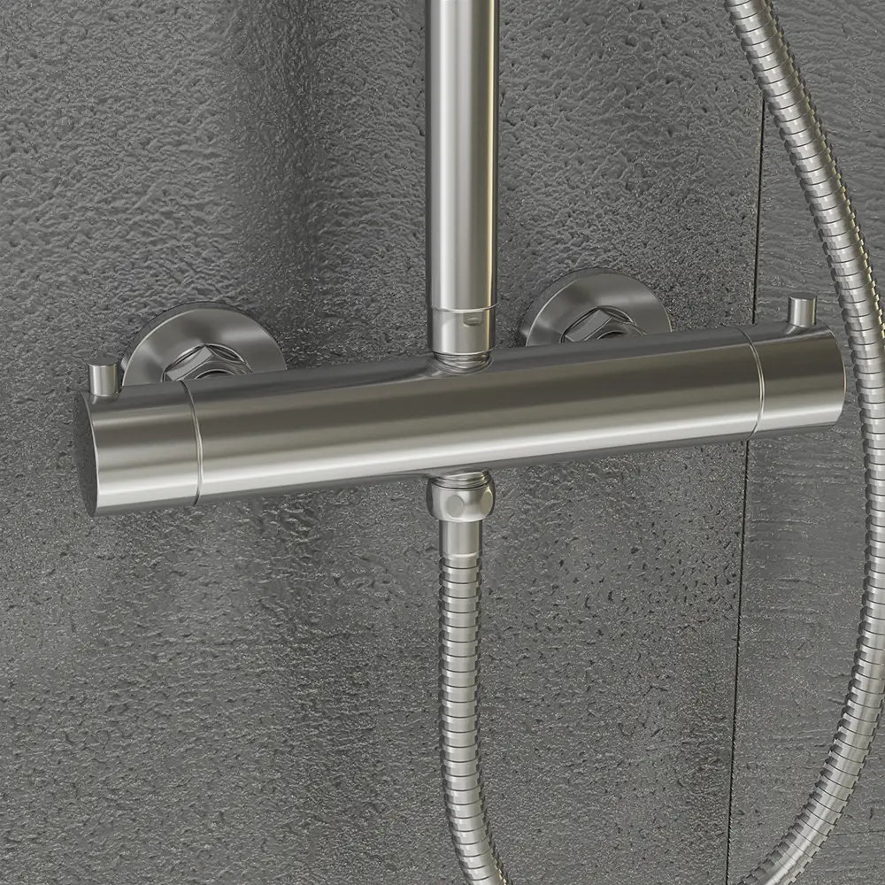 Liri è un set completo per la tua doccia: fornito di un miscelatore dotato di deviatore, doccetta ad una funzione comprensiva di flessibile in acciaio da 150 cm ed un soffione ultraslim di forma tonda da 20 cm con all'interno ugelli in silicone facili da pulire.