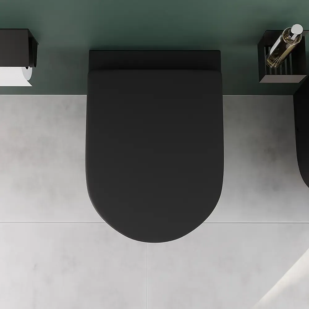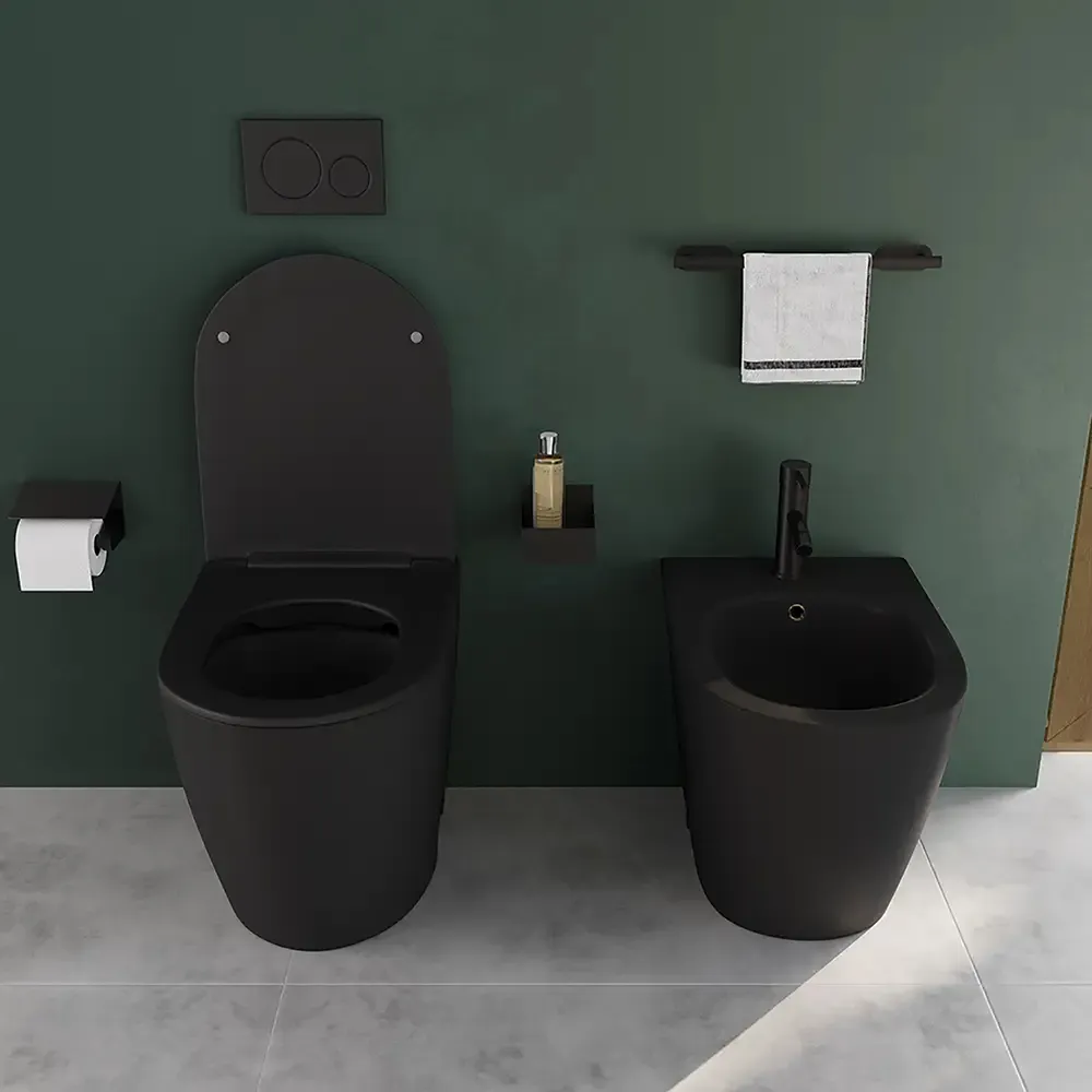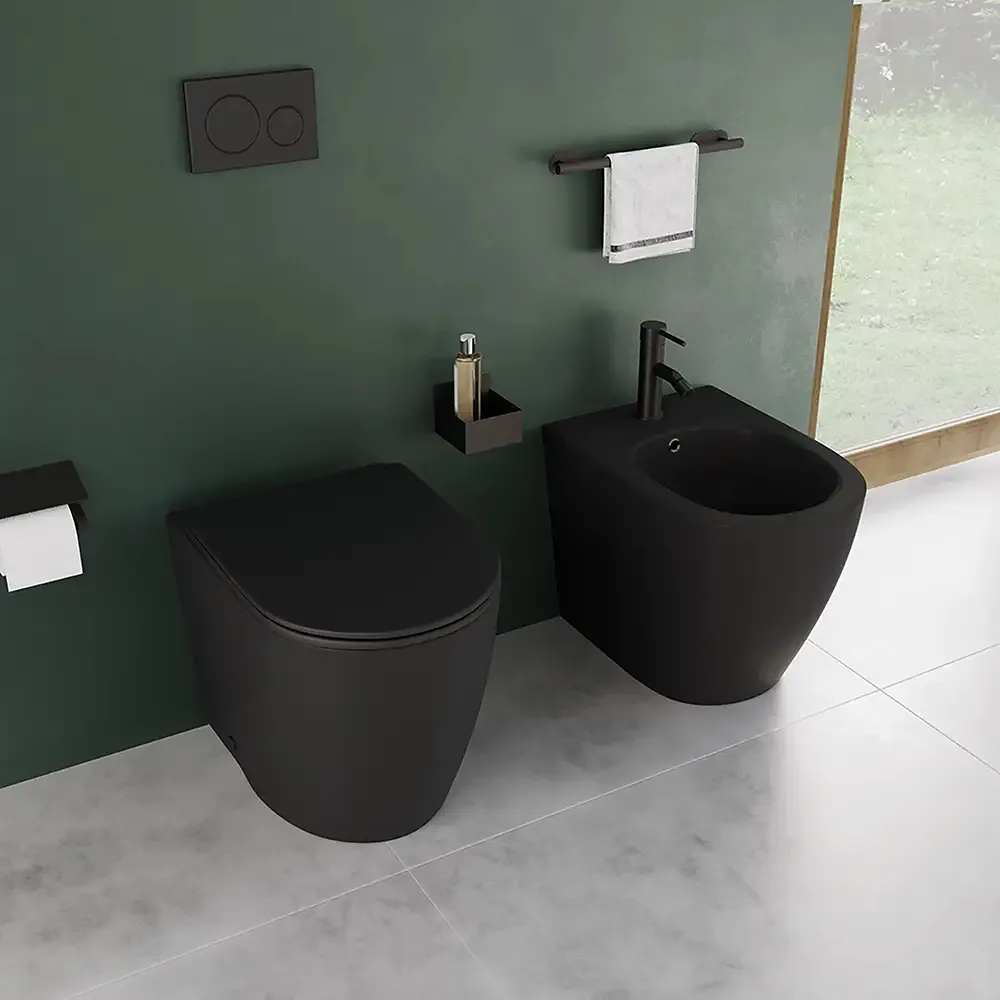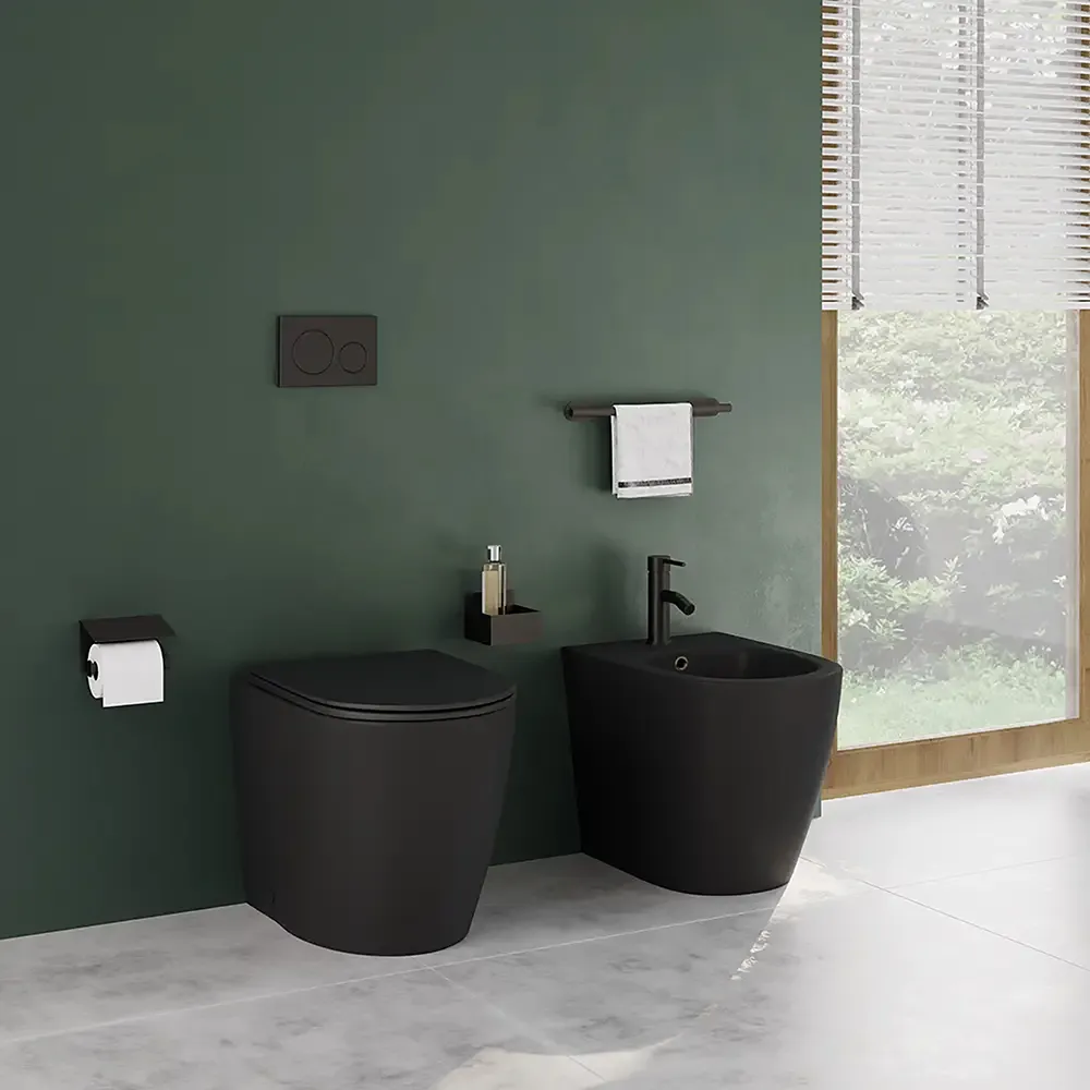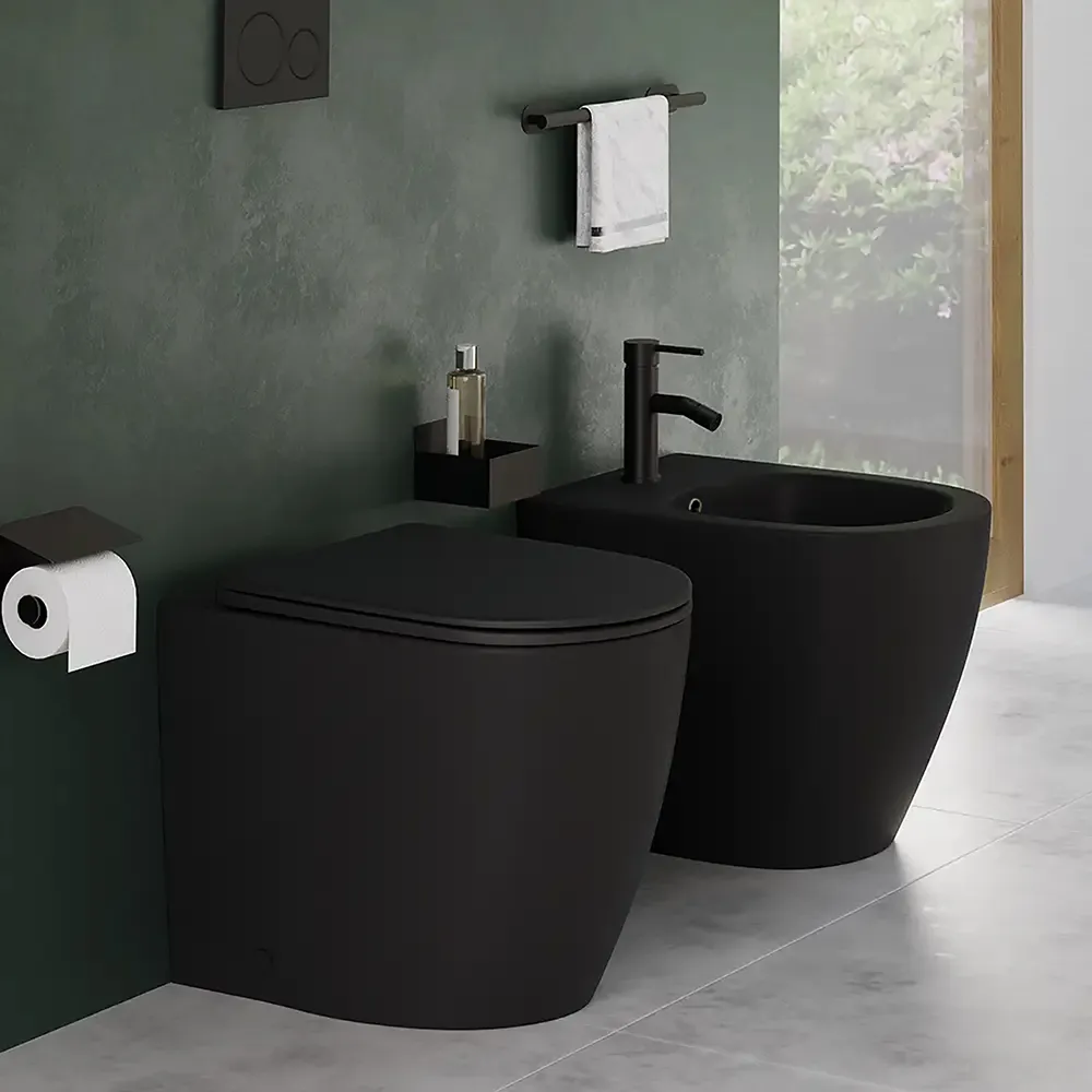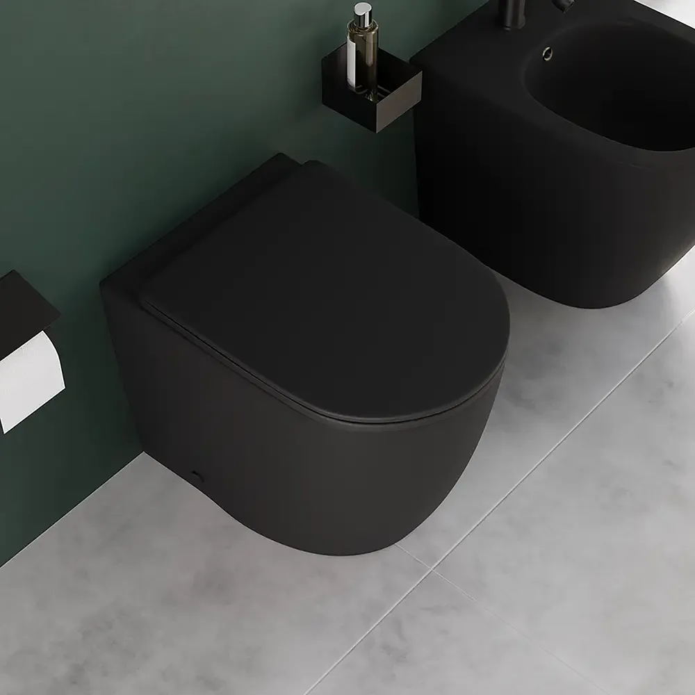 Coppia di sanitari filomuro ceramica nero opaco vaso rimless copriwc soft-close e bidet | Europa Small