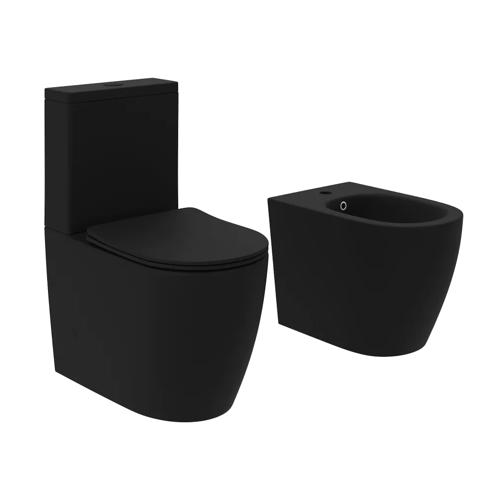 Coppia di sanitari filomuro vaso monoblocco rimless e bidet nero opaco | Europa