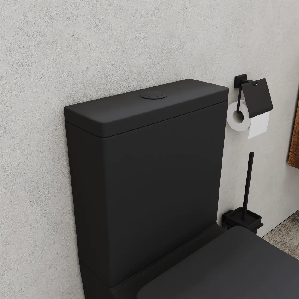 Il wc si presenta in versione monoblocco e include la cassetta di scarico in ceramica in perfetto abbinamento, già completa di meccanismo interno e doppi tasti in finitura nero opaco.