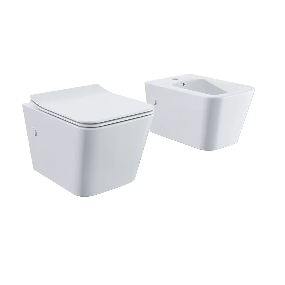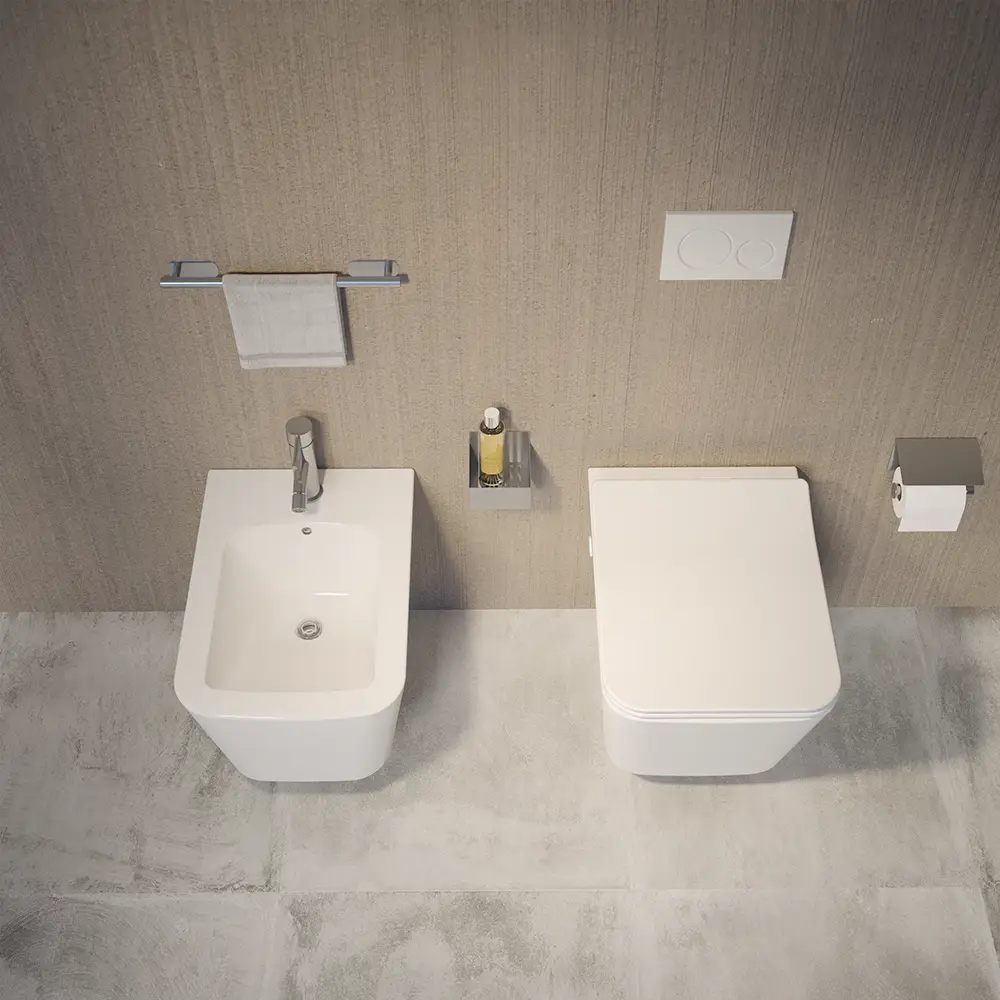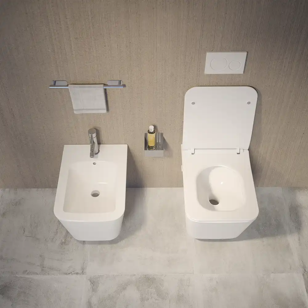 Coppia di sanitari sospesi in ceramica bianco lucido vaso rimless con copriwc soft-close e bidet | Londra