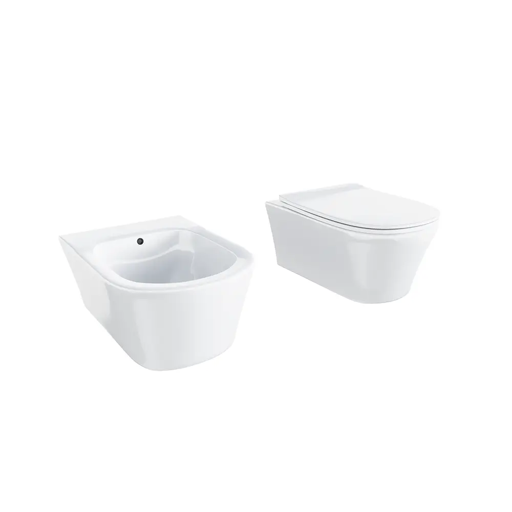 Coppia di sanitari sospesi in ceramica wc e bidet bianco lucido rimless con copri-wc soft-close | Berlino