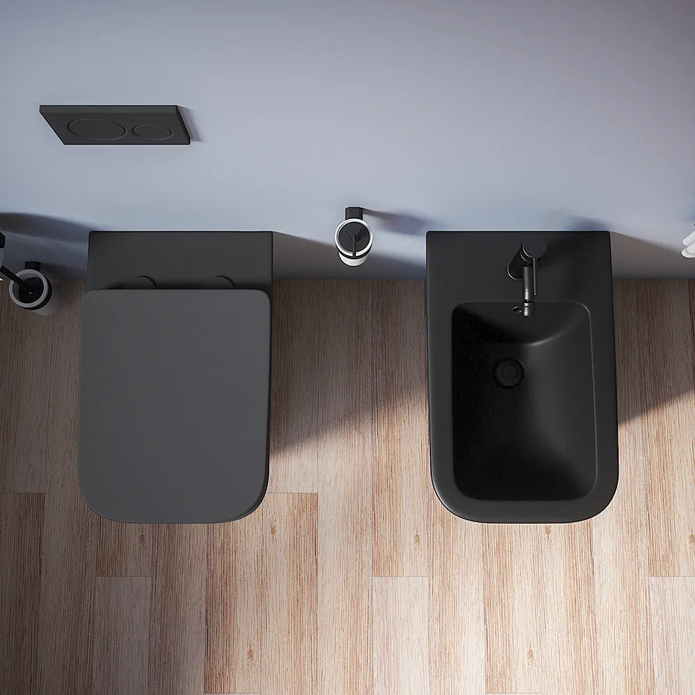 Coppia sanitari in ceramica filomuro vaso rimless, bidet e copri-wc nero opaco | Kyoto